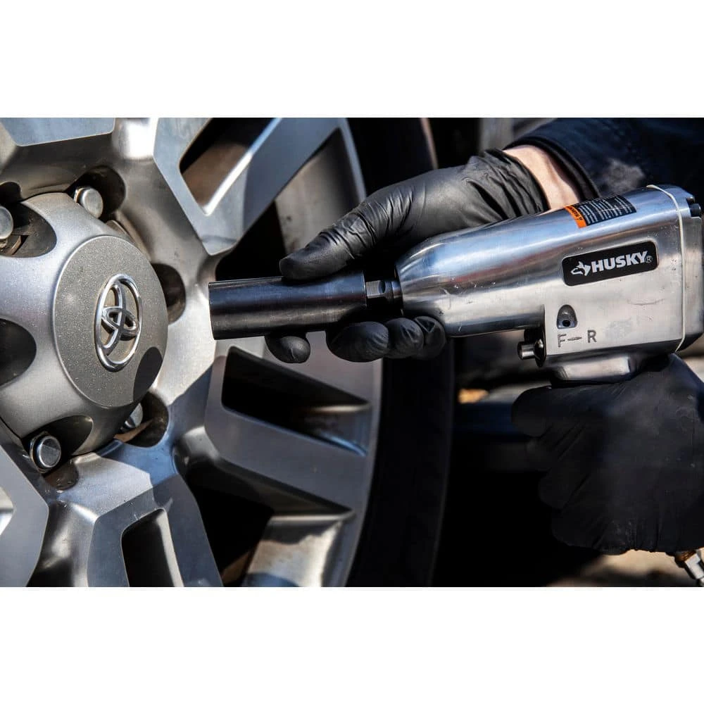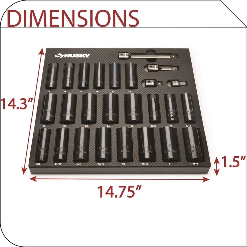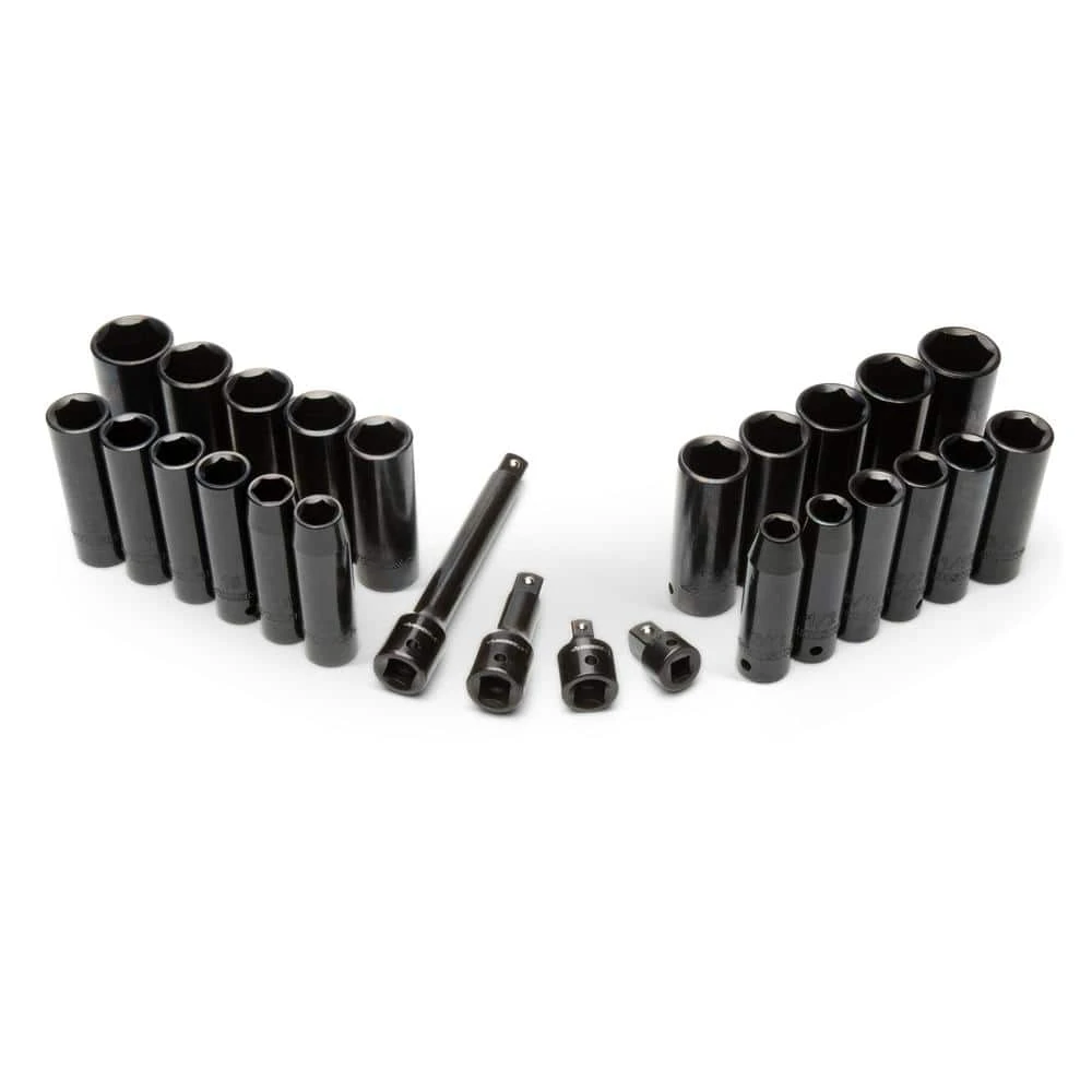 Husky 1/2 in. drive deep SAE/Metric impact socket set contains 50 total pieces: 43 deep 6-point impact sockets and 7 impact adaptors and extensions. Features sockets forged from chrome molybdenum alloy steel (Cr-Mo) and designed to withstand rigors of heavy-duty auto and industrial use. Size markings have been hard stamped into the sockets for quick and easy identification that will never wear away. These impact sockets also feature off-corner loading which helps prevent fastener rounding, plus a pin hole at the base of each socket for use with pin for a secure attachment to drive tools. An oiled black oxide finish gives you maximum corrosion resistance. This 50-piece Husky deep impact socket set is perfect for both the professional mechanic’s or DIYer’s garage.