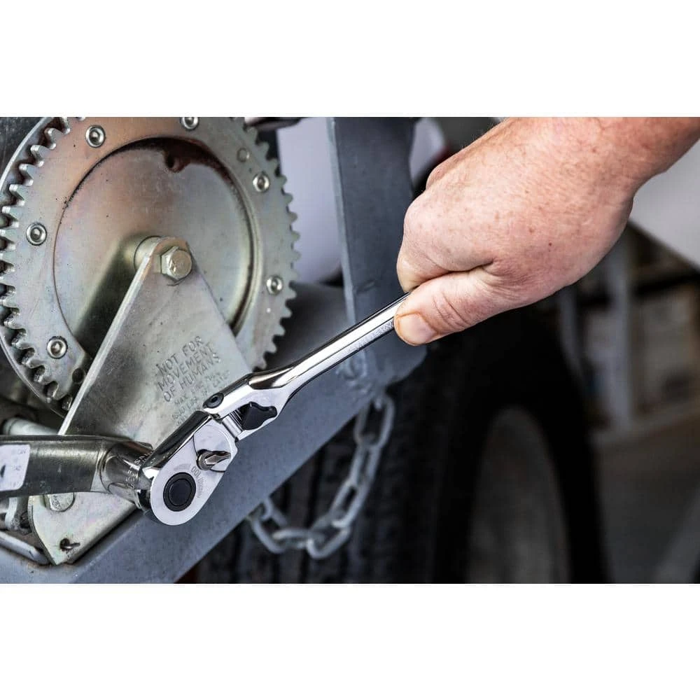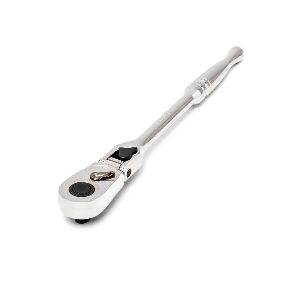 The Dual-Pawl technology of the New Husky 100-Position 3/8 in. drive ratchet provides access to turn fasteners where other ratchets can’t with it’s ultra-narrow 3.6° arch swing. Not only can the head flex to 7 different angles but it also has a locking trigger to hold head in place. It is 10% longer handle allows for increased reach to access hard reaching fasteners and improves overall leverage.