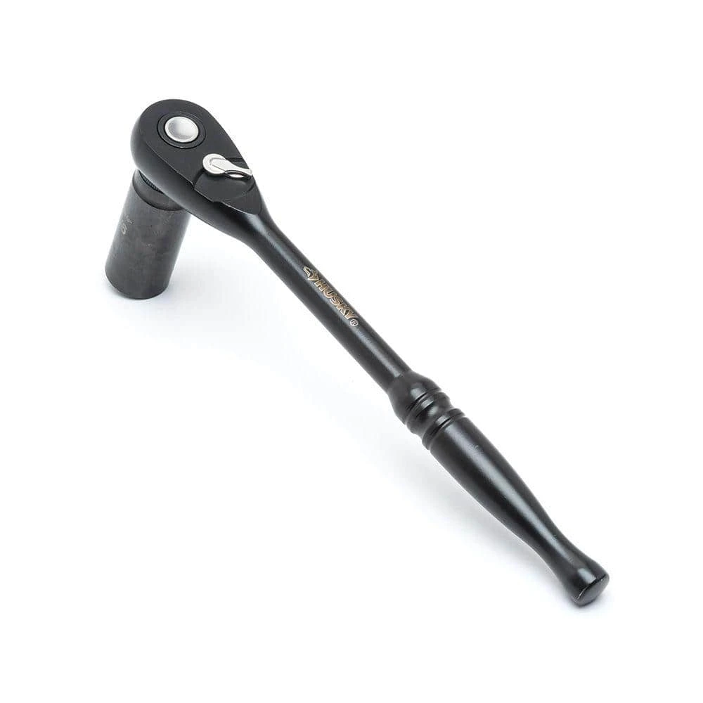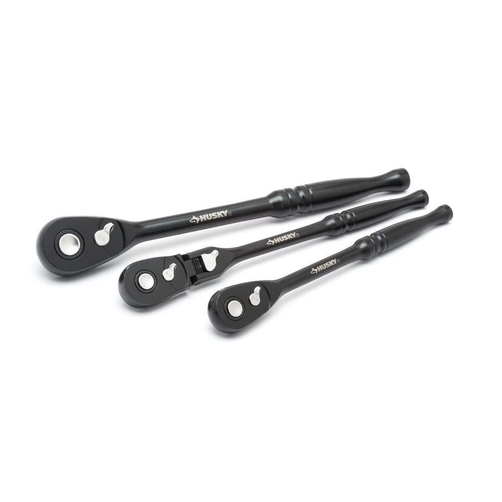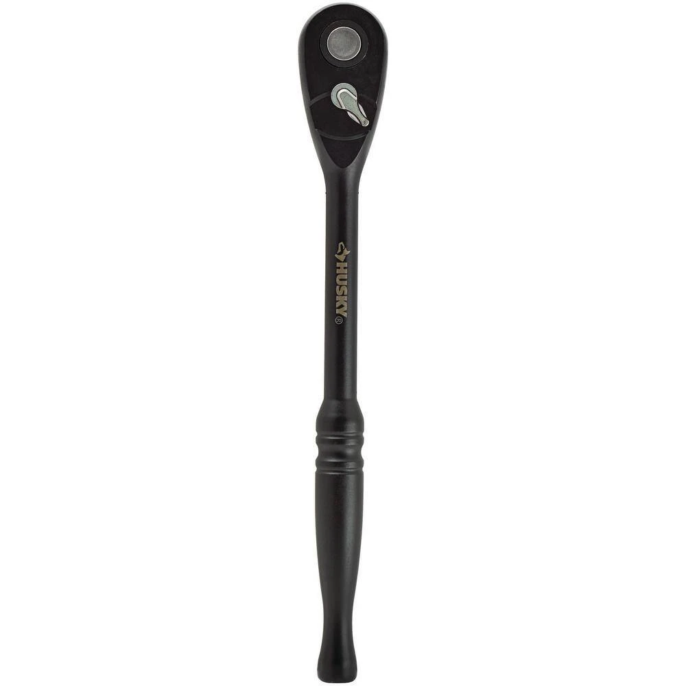 The Dual-Pawl technology of the New Husky 100-Position 3/8 in. drive ratchet provides access to turn fasteners where other ratchets can’t with its ultra-narrow 3.6ยฐ arch swing. It is 10% longer handle allows for increased reach to access hard reaching fasteners and improves overall leverage. The Industrial grade black finish gives the tool a sleek look while adding durability and corrosion prevention.