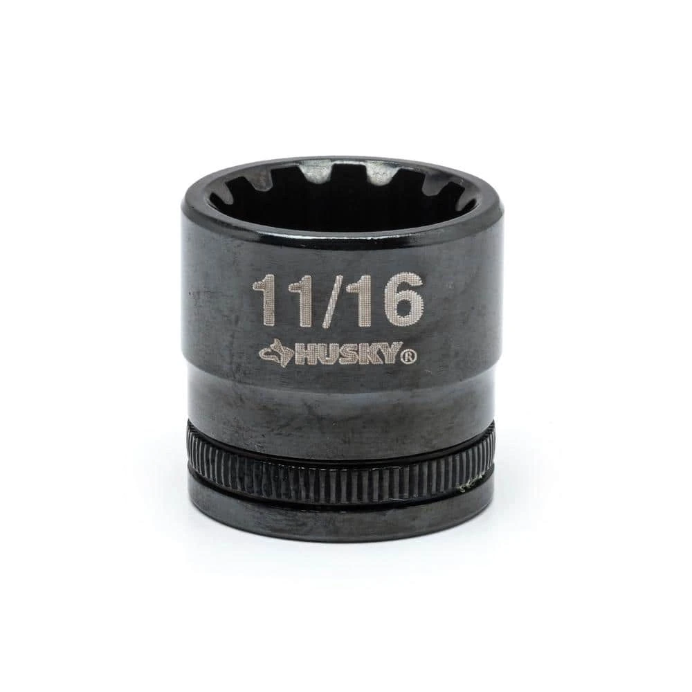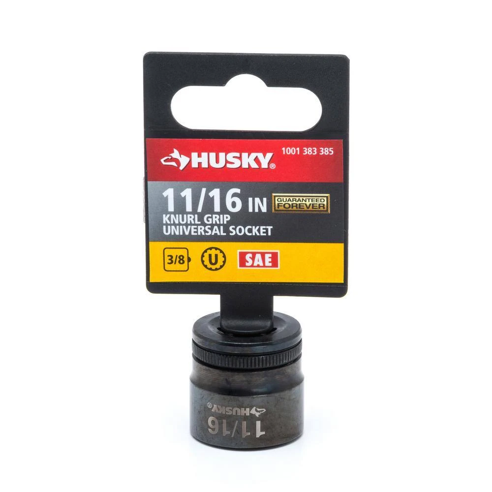 Husky Knurl Grip Universal Sockets feature a knurled ring around the base of the socket providing added grip when using the socket without a drive tool. Sockets also have a tapered base (sizes 9/16 in. – 3/4 in.) making sockets easier to grip when removing them from a drive tool. These Universal Style sockets are designed to fit 6 different styles of fastener heads using only a single socket, reducing time need to swap between multiple tools. The Industrial-grade black finish gives the tool a sleek look while adding durability and corrosion prevention.