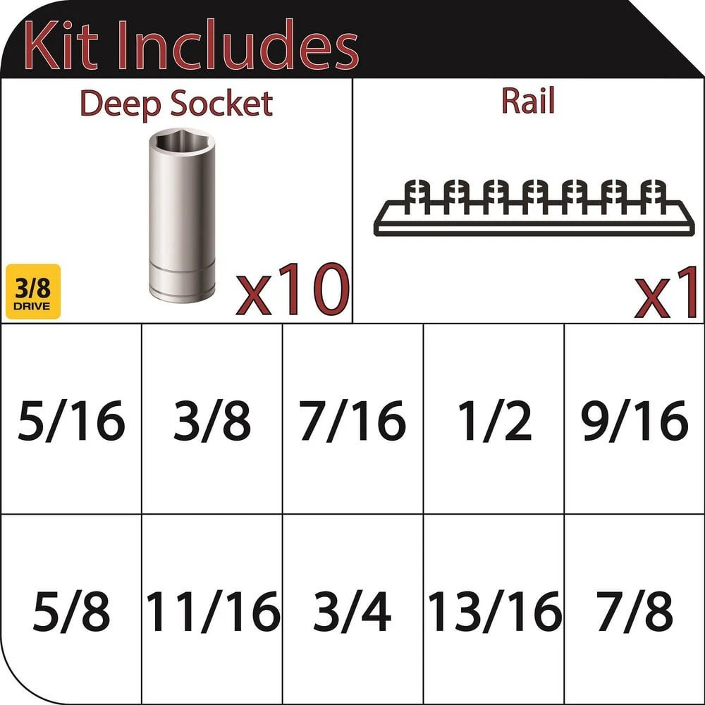 - 10-piece set includes 3/8 in. drive 6-point deep sockets: SAE – 5/16, 3/8, 7/16, 1/2, 9/16, 5/8, 11/16, 3/4, 13/16, 7/8 in.