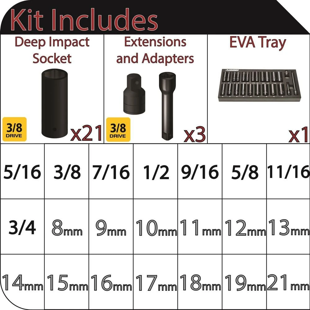 Husky 3/8 in. Drive Deep SAE/Metric Impact Socket Set contains 24 total pieces: 21 deep 6-point impact sockets and 3 impact adaptors and extensions. The set features sockets that are forged from chrome molybdenum alloy steel (Cr-Mo) and designed to withstand rigors of heavy-duty auto and industrial use. Size markings have been hard stamped into the sockets for quick and easy identification that will never wear away. These impact sockets also feature off-corner loading which helps prevent fastener rounding, plus a pin hole at the base of each socket for use with pin for a secure attachment to drive tools. An oiled black oxide finish gives you maximum corrosion resistance. This 24-piece Husky deep impact socket set is perfect for both the professional mechanic’s or DIYer’s garage.