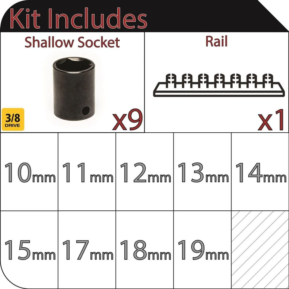 - Set includes (9) 3/8 in. drive 6-point impact sockets: Metric – 10, 11, 12, 13, 14, 15, 17, 18, 19 mm