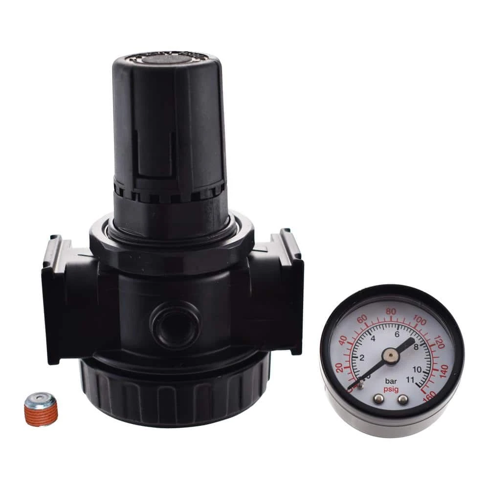 The Husky 3/8 in. Regulator with Gauge provides regulated output pressure of 0 – 150 psi for proper tool operation. It has a self-relieving design that vents downstream air flow for easier adjustment. A locking pressure knob prevents accidental pressure changes. The 3/8 in. inlet and outlet hook up to standard 3/8 in. air hose and piping.