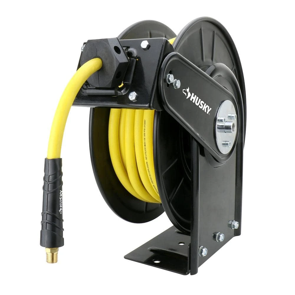 Simply mount this reel right up to your wall, workbench or compressor dolly. PVC Air Hose and Reel with a 3/8 in. x 2 ft. PVC lead hose allows for easier utilization. Air outlet: 1/4 in. NPT (Male). Air inlet: 1/4 ft. NPT (Female).