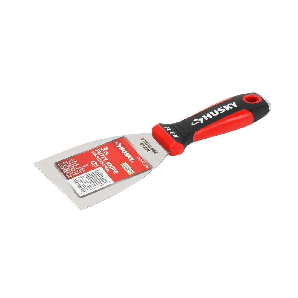 The Husky 3 in. flexible putty knife features a hollow ground stainless steel blade that offers the highest durability and quality finish. The flexible blade easily bends to provide smooth and easy application of filler compound to patch and repair cracks, holes, or scratches prior to painting. The ergonomically designed cushioned handle provides added comfort and grip and features a hammer end to drive in nails. Lastly, the easy peel label can be removed from the blade without leaving behind residue.