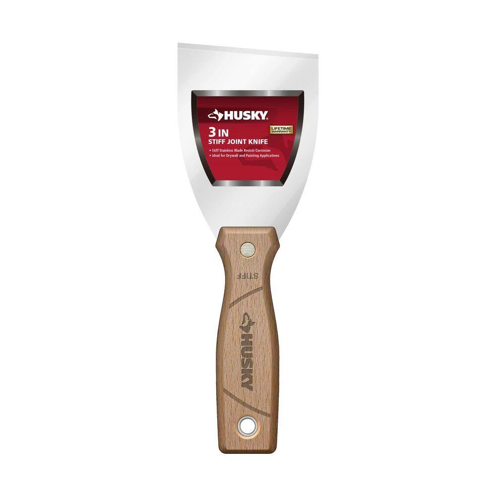 The Husky 3-Pack Wooden Handle Stainless Steel Putty Knife and Scraper Set includes a 1.5-inch putty knife, a 3-inch scraper, and a 6-inch putty knife. This versatile set is designed to handle a variety of tasks with ease. Crafted with a beech wood handle, these tools provide a comfortable and secure grip, preventing slips and enhancing control during use. The handles have a laser etched logo, adding a touch of quality and craftmanship, while the stainless-steel blade provides strength and durability. Built with dual rivet construction, these knives and scrapers are engineered to withstand the demands of painting, drywall insulation, and repair work. The full-tang design of the blades ensures stability and balance, making these tools reliable for heavy-duty applications.