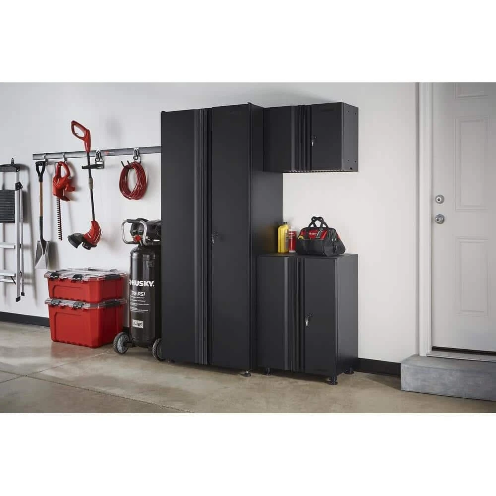 Organize your garage or workshop space with this Husky 3-Piece Regular Duty Welded Steel Garage Storage System in Black. With cord grommets, locks, adjustable shelves and an adjustable drawer, this set has plenty of space to store your tools. The drawers have ball-bearing slides so they ft. re easy to open and close. The best part is it comes preassembled, so installation is easy.