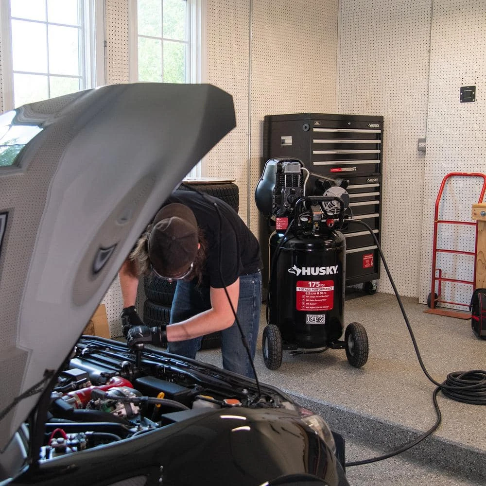 The Husky 30 Gal. oil lubed belt drive air compressor is industry leading with 2-stage performance in a single stage pump. This air compressor provides 54% faster recovery time compared to 30 Gal. 2 Stage compressors with 175 Max PSI. The heavy-duty, cast-iron, two-cylinder pump is oil lubricated for a long life and delivers 6.2 CFM at 90 PSI which provides 40% higher SCFM air delivery versus typical 30 gallon 2 Stage compressors with 175 PSI and 4.4 CFM at 90 PSI. At 76 dBA, the oil lubricated twin cylinder pump with cast iron construction is 71% quieter versus other 30 Gal. 2 Stage compressors with 175 Max PSI . The poly-v pulley & drive belt provides smooth operation of the air compressor with less vibration. In addition, the high efficiency aluminum flywheel is engineered to provide maximum air flow and allows for an efficient and smooth start-up. The Husky 30 Gal. 175 PSI air compressor is perfect for light automotive tasks, medium duty metal working and agricultural equipment repairs.