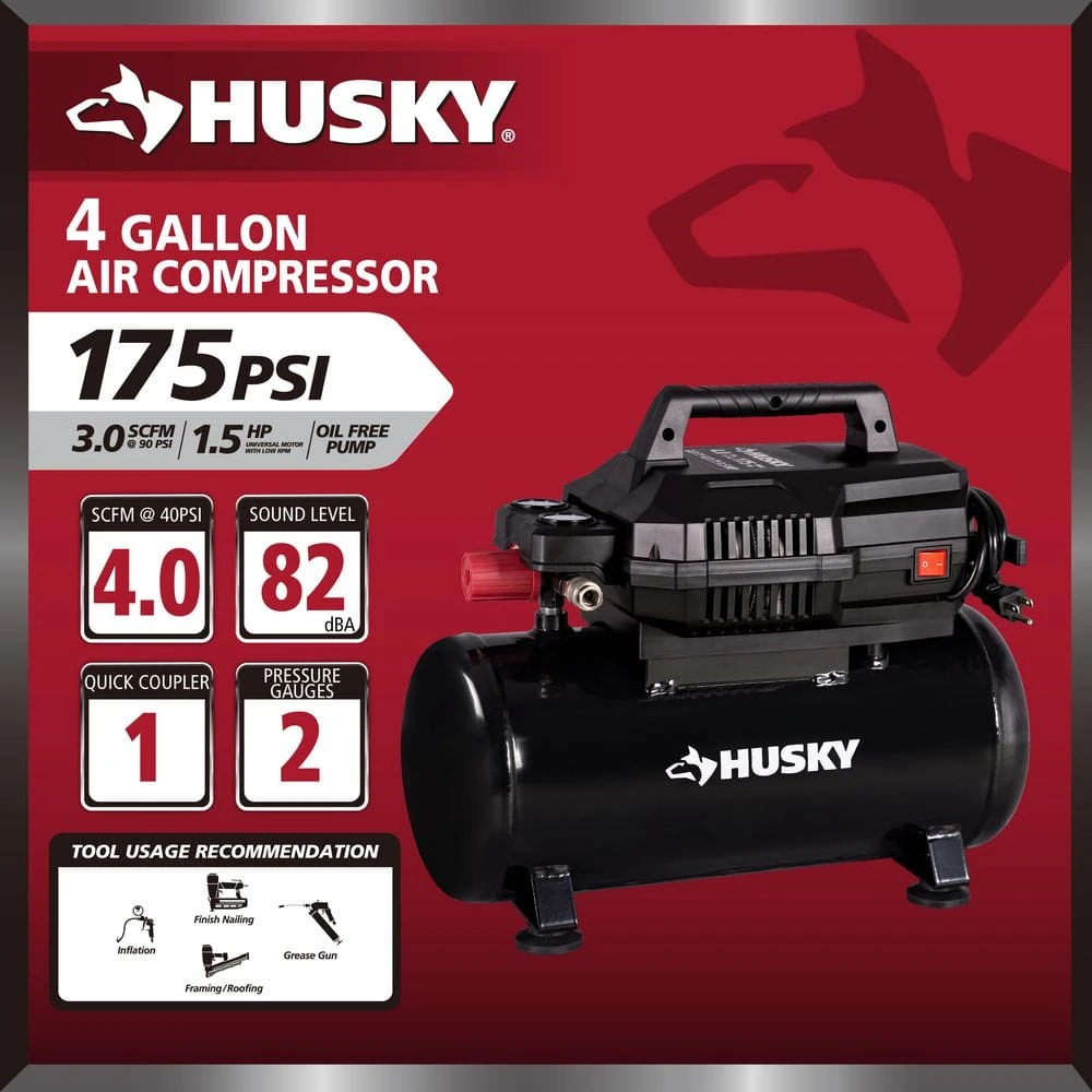 Take on any project with the Husky 4 Gal. Electric High Performance Air Compressor Combo Kit, a complete solution that’s ready to tackle tough jobs right out of the box. This kit features a powerful 4-gallon air compressor with a 1.5 HP motor, delivering 175 PSI max pressure and 3.0 SCFM at 90 PSI to handle trim, fastening, and more with ease. Designed for pros and DIYers alike, it includes a 25-foot PVC air hose for flexible reach and a 2-in-1 brad nailer/stapler for precise, versatile fastening on busy job sites. The oil-free pump eliminates maintenance hassles, while the lightweight design at approximately 47.4 lbs ensures easy portability. Operating on 120V power, this compressor offers convenience for jobsite or home use, built with durable construction to withstand regular demands. Its high-performance capabilities make it ideal for a range of tasks, from tire inflation to nailing projects. Backed by a 2-year limited warranty from The Home Depot and Husky, this kit delivers reliable performance you can trust, whether you’re a weekend warrior or a seasoned professional tackling diverse projects with confidence.