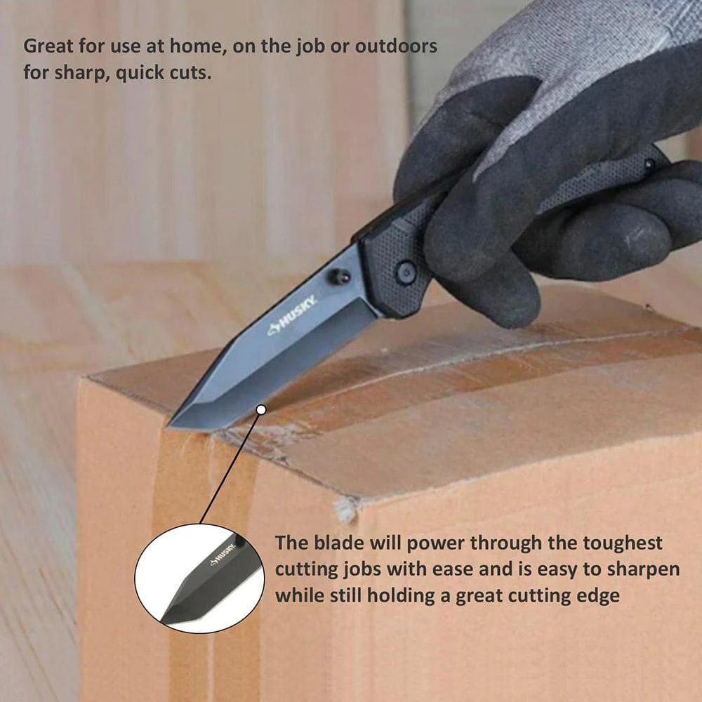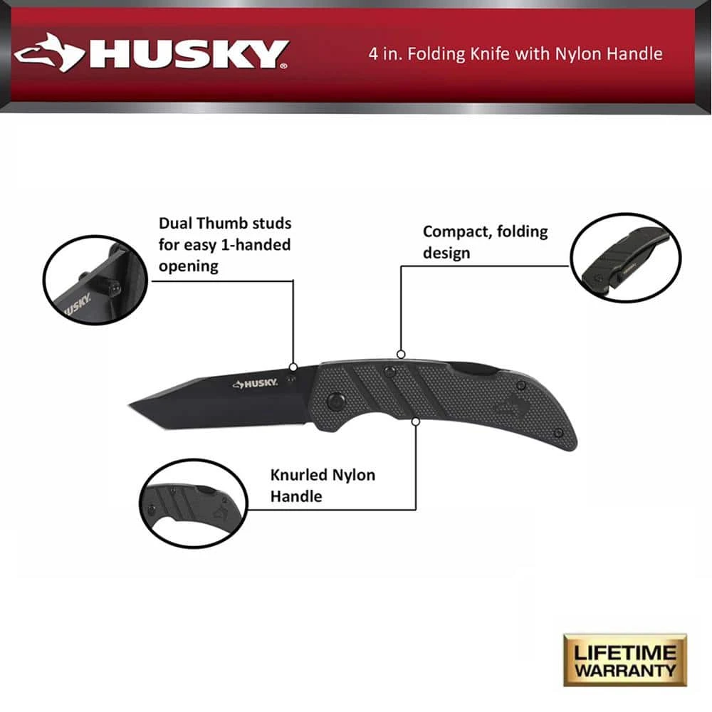 The Husky sporting Nylon handle knife is great for use at home, on the job or outdoors for sharp, quick cuts. The lock-back design locks the blade in place for safe and efficient cutting while the convenient folding design makes it easy to safely store the knife in your pocket for on-the-go. The blade will power through the toughest cutting jobs with ease and is easy to sharpen while still holding a great cutting edge. Thumb studs on both sides of the blade make 1-handed opening easy. The Nylon handle provide powerful grip to handle at different working site with durable and long life performance.