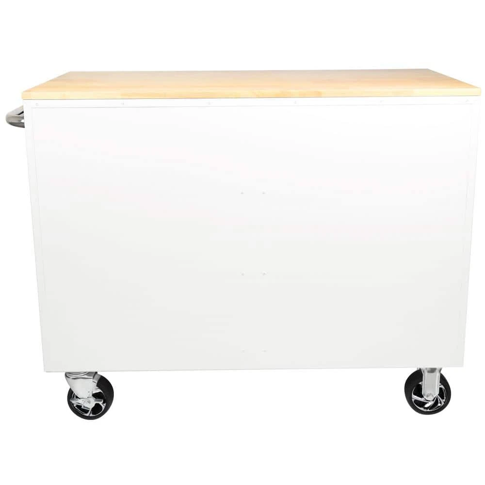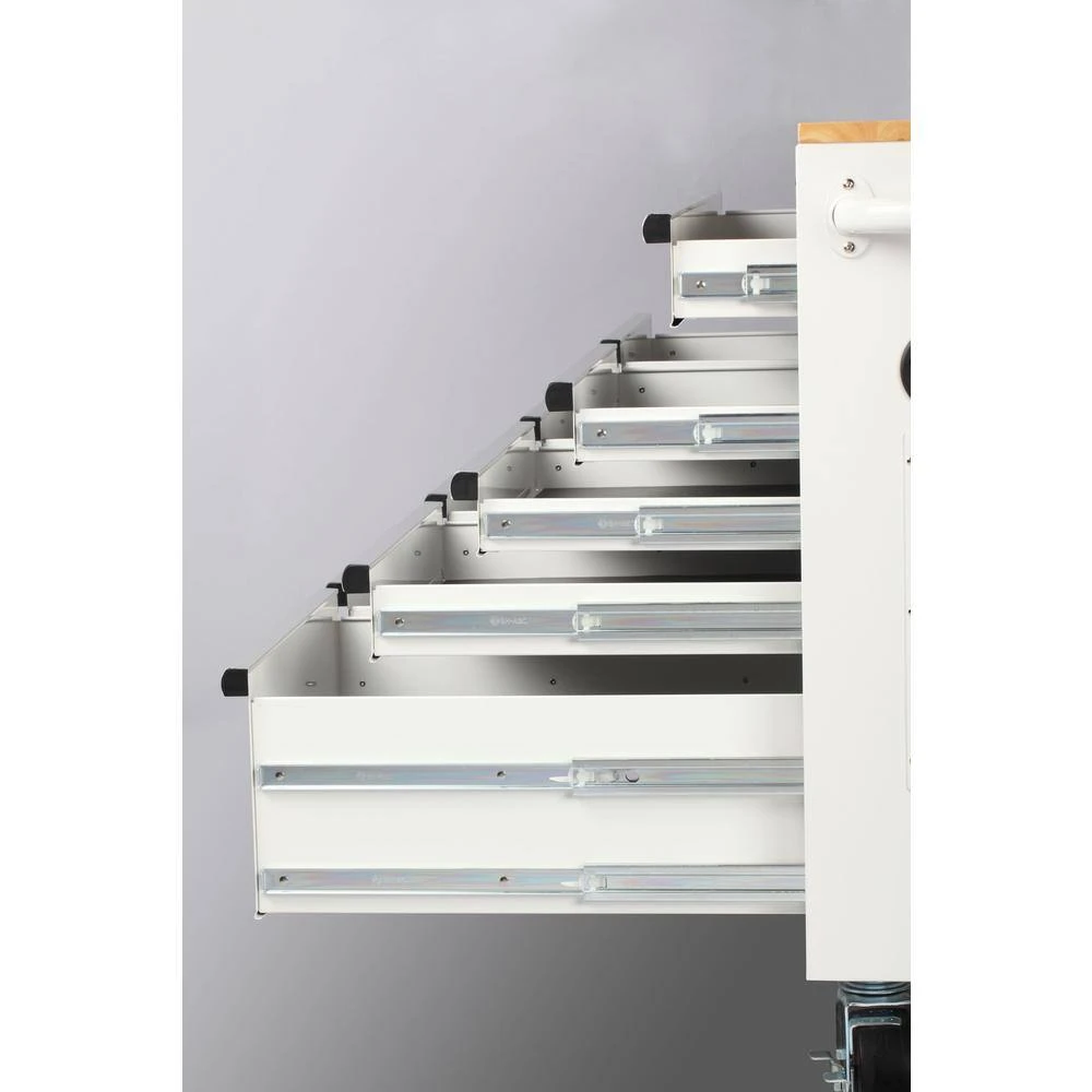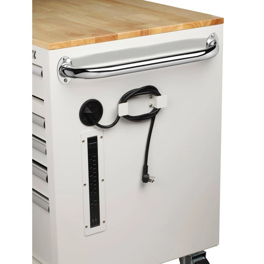 The all new Husky Extra-Deep 46 in. 9-Drawer Mobile Work Bench has arrived. This work bench is 24.5 in. D, which creates 36% more storage capacity than traditional 18 in. D units. The extra-depth also means there is a much larger solid wood top to use as a work surface for all your projects. An integrated power strip on the side of the work bench provides easy access to 6 outlets and 2 USB Ports, so your tools and other electronic devices can always be charged up and ready to go. There is plenty of storage options within the work bench inside the 9 lockable 21.7 in. D drawers. Each drawer glides easily on 100 lbs. rated ball-bearing soft-closing drawer slides and the large bottom drawers have an extra-set of slides to accommodate heavier items up to 200 lbs. Each drawer also has a premium pre-cut drawer liner that will protect both your tools and drawers. Finally, the entire work bench can easily move around your work space with four 5 in. x 2 in. casters and large ergonomic push handle.