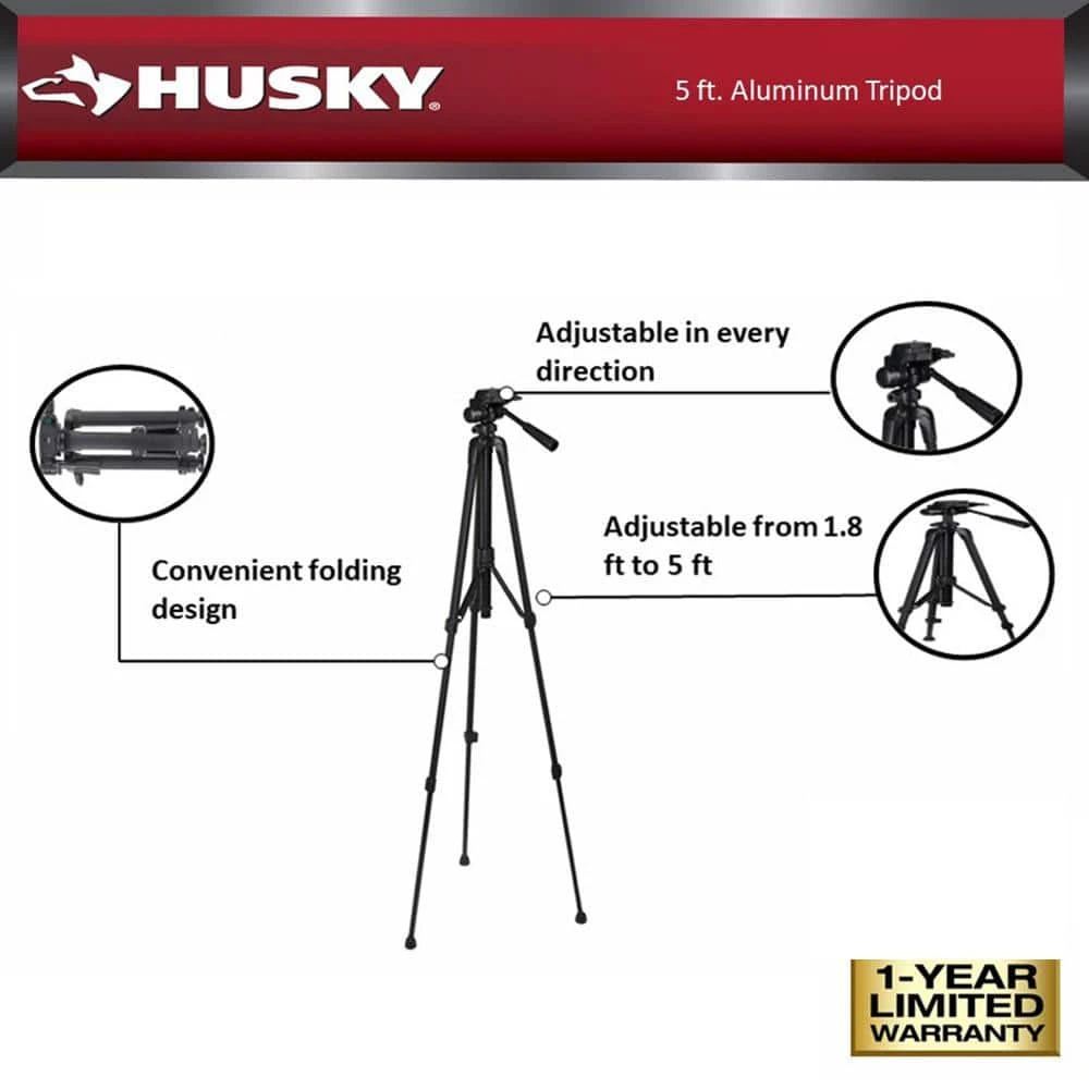 The Husky 5 ft. Compact Aluminum Adjustable Tripod is the perfect companion for your Husky Laser Level. It uses 1/4 in. x 20 thread mount, so it will work with almost any brand of laser level or for a camera or other device. It is compact and lightweight and can adjust from 1.8 ft. to 5 ft. (54 cm to 152 cm). It is adjustable in every direction: rotate 360° on the horizon, rotate 180° vertically. It has a crank-shaft height adjustment that allows for precision alignment and includes a bubble level so you can be sure of a perfect horizon. It also features a quick-release plate, so you can screw in your camera or laser level but quickly release or affix it to the tripod with just 1 lever.