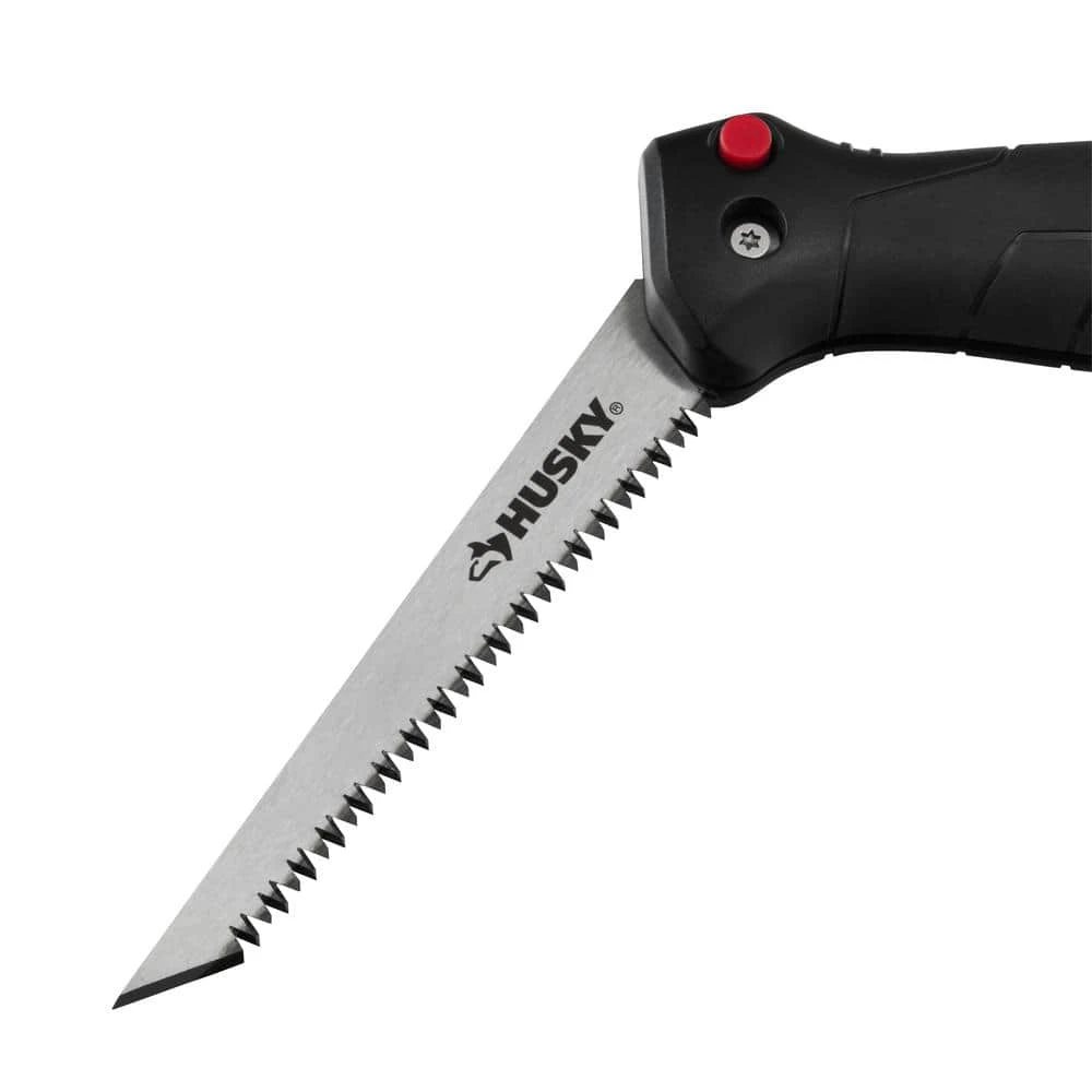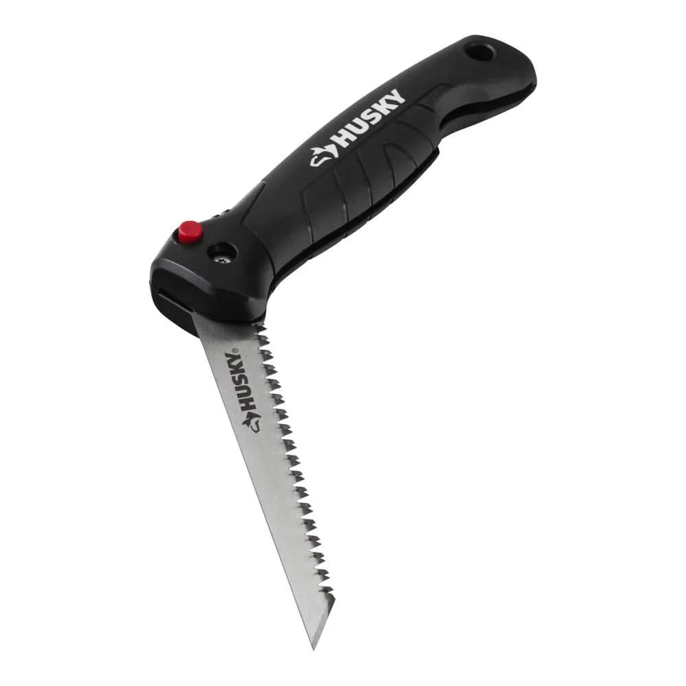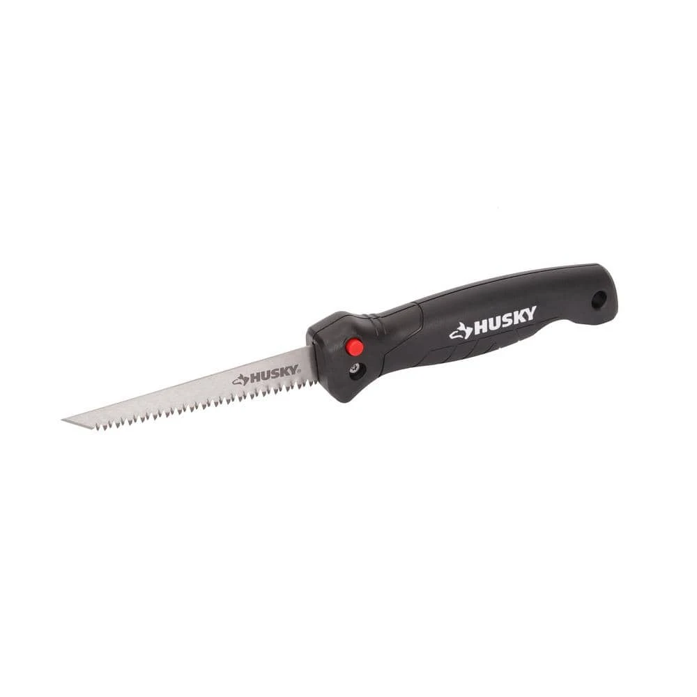 The Husky 5 in folding jab saw cuts mineral wool insulation quickly and with less mess. Due to the unique design of the blade, it acts more like a knife and therefore makes cutting easier. This handy saw can be used to cut rigid insulation, sound proofing materials and non-plastic drop ceiling panels. The rubber grip helps to reduce and minimize fatigue. The blade can be fixed at 0ยฐ,120ยฐ and 180ยฐ.
