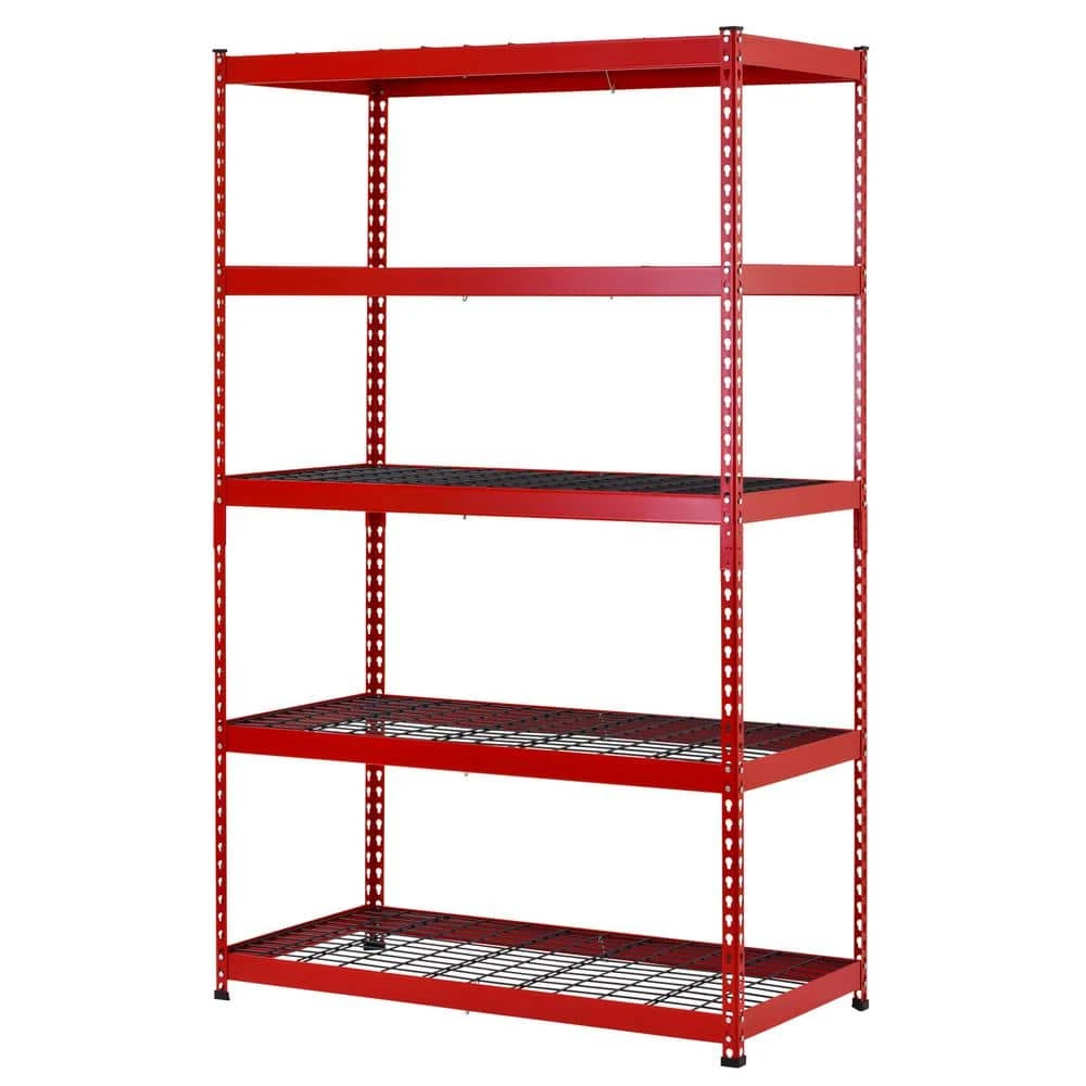 You can assemble this heavy-duty steel shelving unit vertically as shelves or horizontally as a workbench. Its features Red beams and Black wire shelves. You can adjust this multipurpose unit’s shelves in 1.5 in. increments to fit any storage need. It features a rivet lock system that provides strength and rigidity.