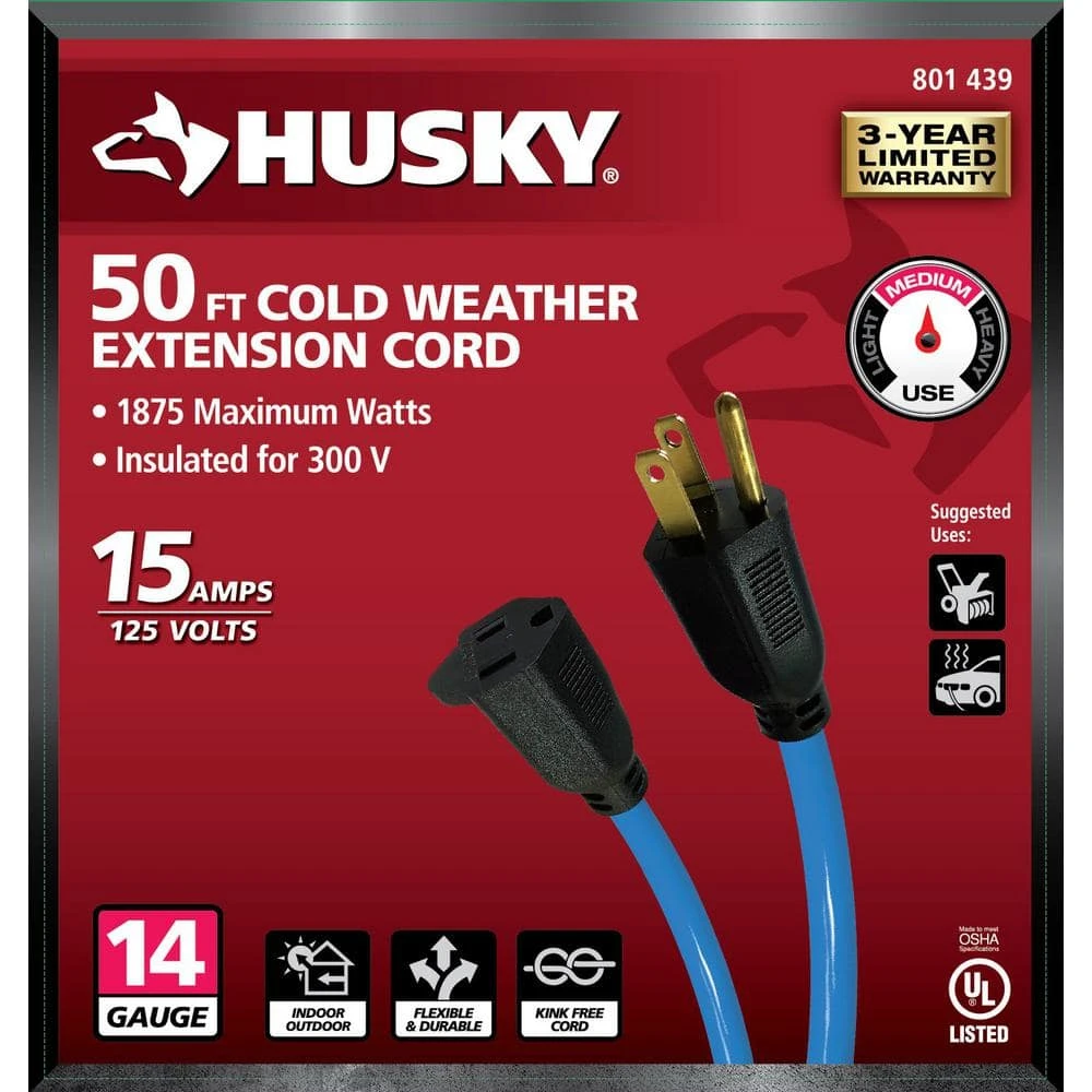 This Husky 50 ft. 14/3 Medium Duty Cold Weather Extension Cord provides you with flexibility in cold temperatures. The SJTW jacket stays flexible from -58ยฐF to 140ยฐF. This cord features grounded plugs providing you with additional safety. The plugs are molded on giving the cord additional durability.