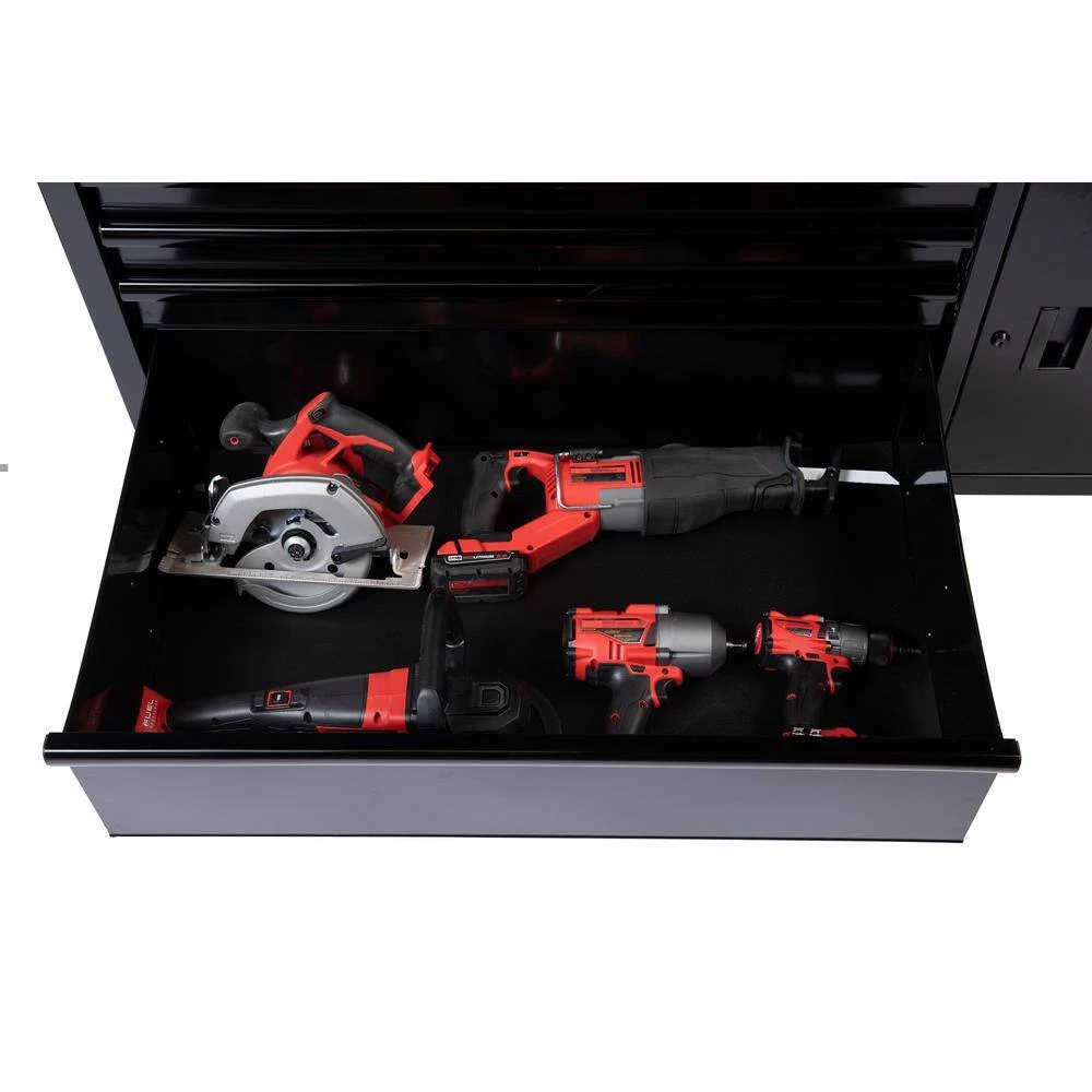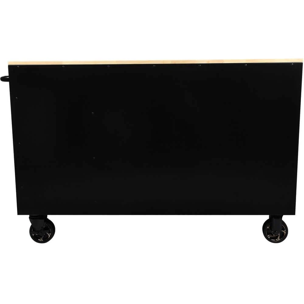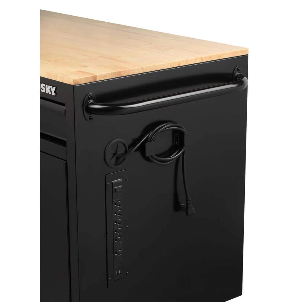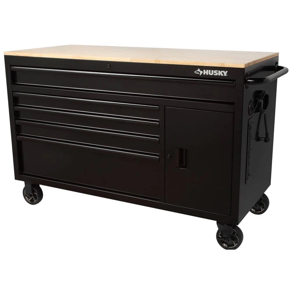 The Husky 56 in. W x 24.5 in. D 5-Drawer Mobile Workbench with Solid Wood Top is a new and exciting configuration in the Husky mobile workbench lineup. This workbench has an all-welded steel construction and is available in a variety of powder coat finishes. This unit has a solid wood top that creates an expansive 1,372 sq. in. to work on any project. Each drawer opens and closes easily on ball-bearing slides that are rated for up to 120 lbs. and features a soft-closing retention system that prevents the drawers from slamming closed and ensures they stayed closed. The bottom drawer has 2 sets of slides to accommodate even heavier tools and supplies. All drawers have pre-cut liners included to protect your tools. On the right-hand side of the workbench is a bulk storage area that provides 6,430 cu. in. of storage space and an adjustable shelf rated for 130 lbs. The right-hand exterior side of the workbench has an integrated power strip with 6 power outlets and 2 USB ports that allows you to keep your tools and electronic accessories always powered up. Making this workbench mobile are four 5 in. x 2 in. casters with stylish hubcaps that can support up 1200 lbs. and an ergonomic tubular push handle. Finally, have-piece of mind knowing your tools are secured with the internal locking system.