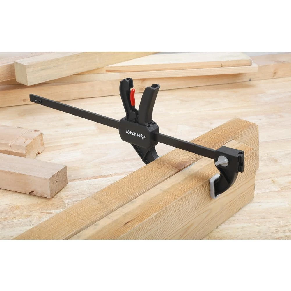 The 4-piece 6 in. medium-duty trigger clamps offer increased clamping pressure. The new expandable feature allows for 2 clamps to be combined into 1 single clamp. The feature allows the user to add an additional 6 in. of clamping length to their bar clamps when combined. These bar clamps also feature a quick release mechanism for easy changes to the expandable or reversible position. They have 100 lbs. clamping force. Reinforced nylon body makes wear and tear difficult.