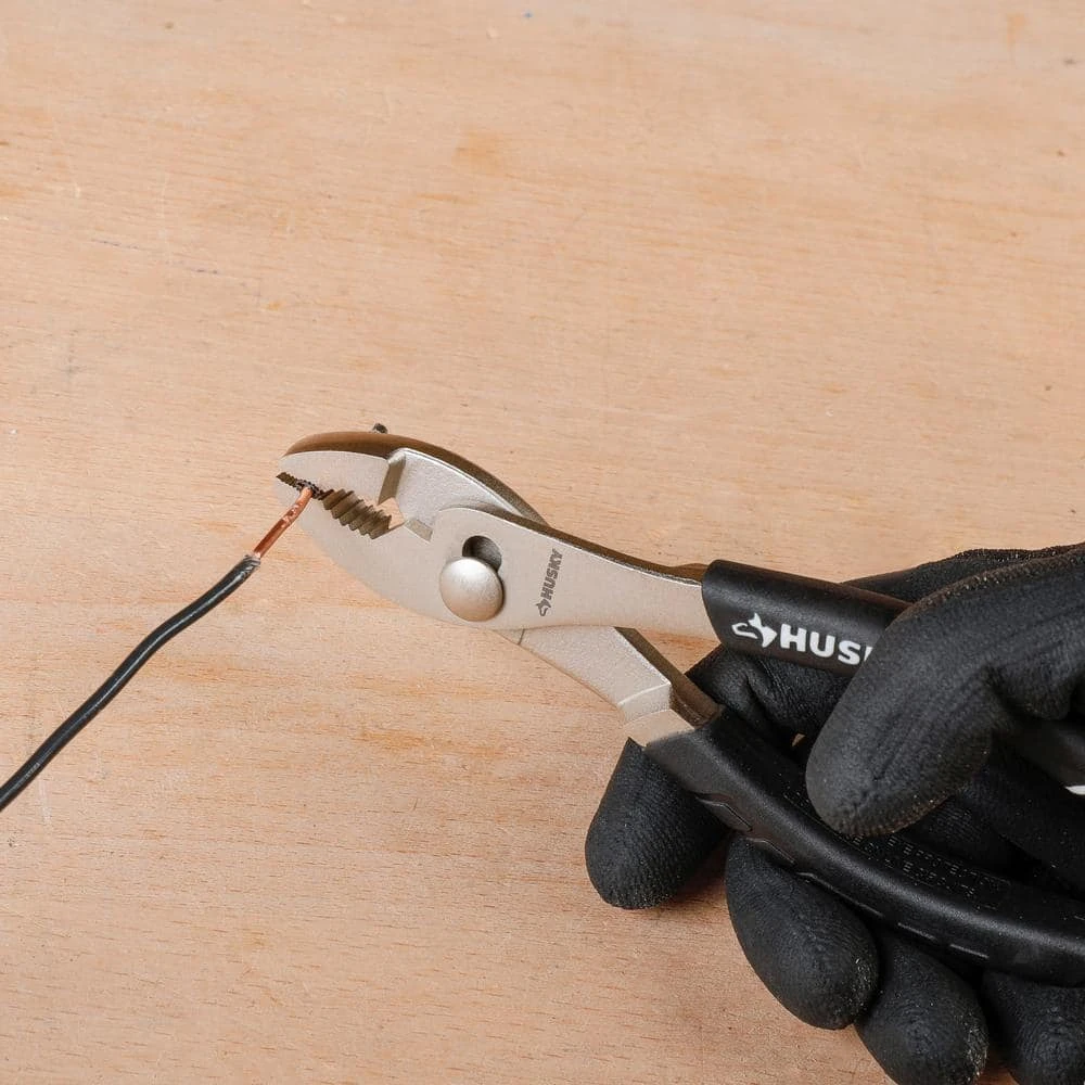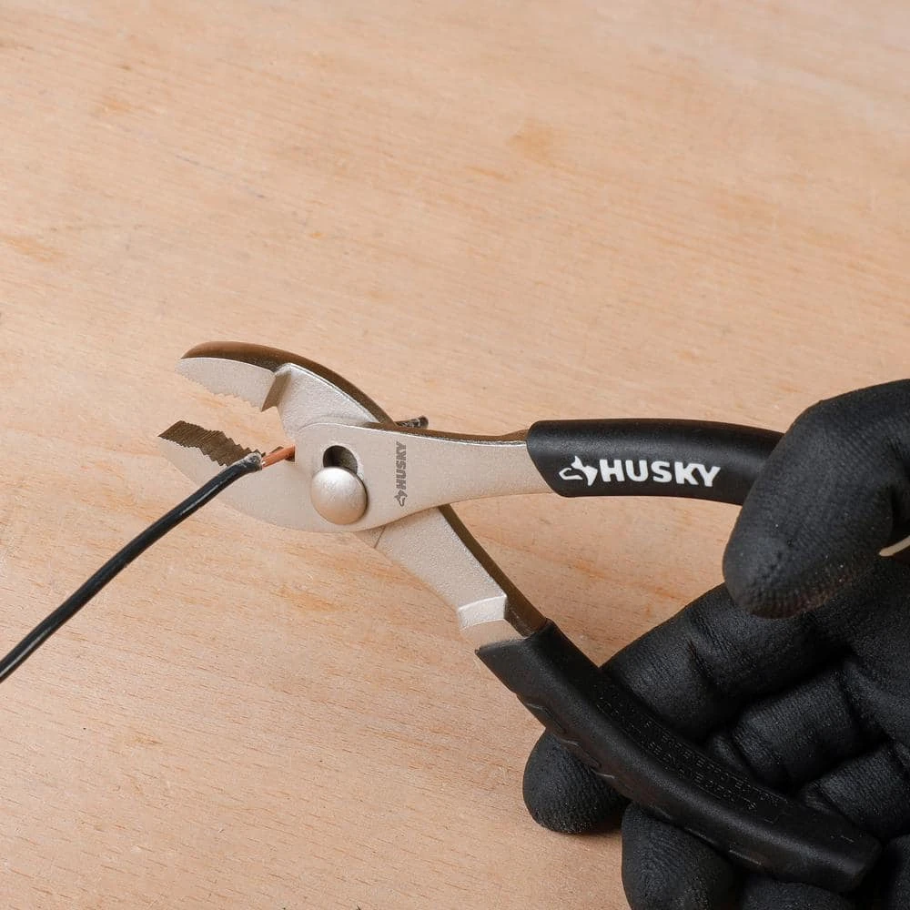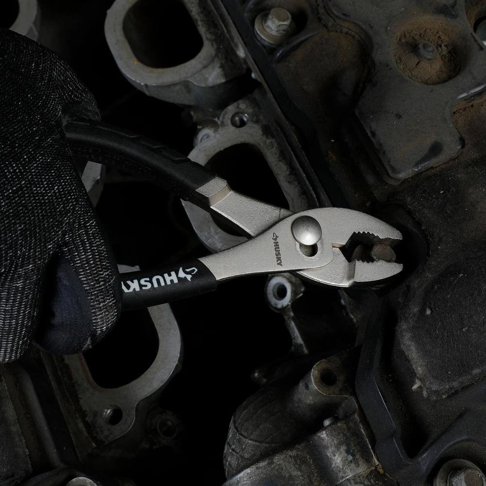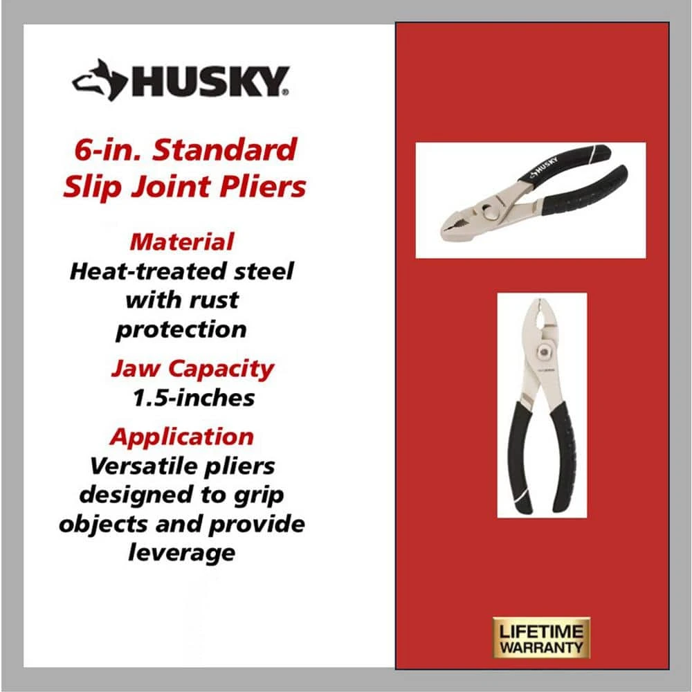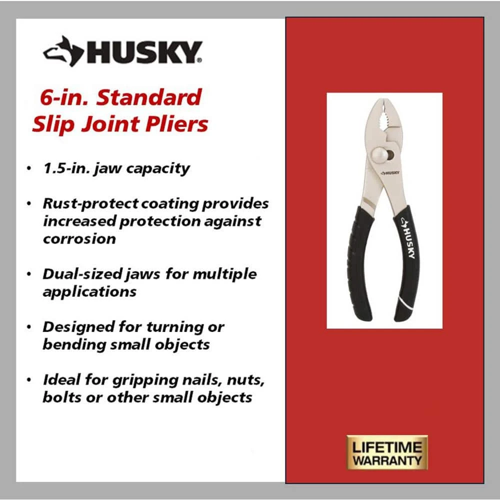 The Husky 6-inch standard slip joint pliers are designed for turning or bending small objects. They provide a strong grip, making them ideal for gripping nails, nuts, bolts, and other small items. Common uses also include holding and pressing objects together or cutting wire. These pliers feature a dual-sized jaw for various applications and are built to be durable with a comfortable, non-slip grip. Additionally, a rust-protective coating offers increased protection against corrosion. The low-profile design allows the pliers to fit into confined and tight spaces easily.
