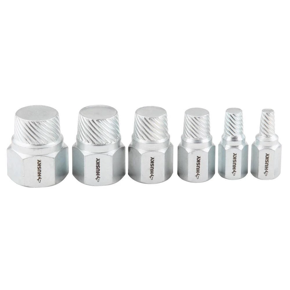 Husky’s Pipe Nipple Extractor Set removes broken or frozen pipe nipples with ease. The extractors feature a durable, heavy-duty hardened steel construction and can accommodate 1/8 in, 1/4 in., 3/8 in., 1/2 in. and 3/4 in. pipe nipples. Also extracts broken 1/2 in. shower arms. An adjustable wrench or box wrench is required for use (sold separately). A diagonal knurl pattern provides enhanced user comfort. Features engraved sizing for easy wrench selection. Finally, the tool is covered by the Husky lifetime warranty.