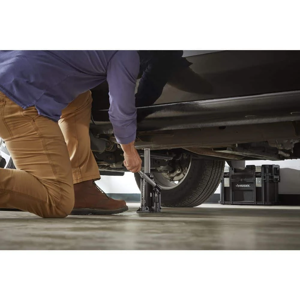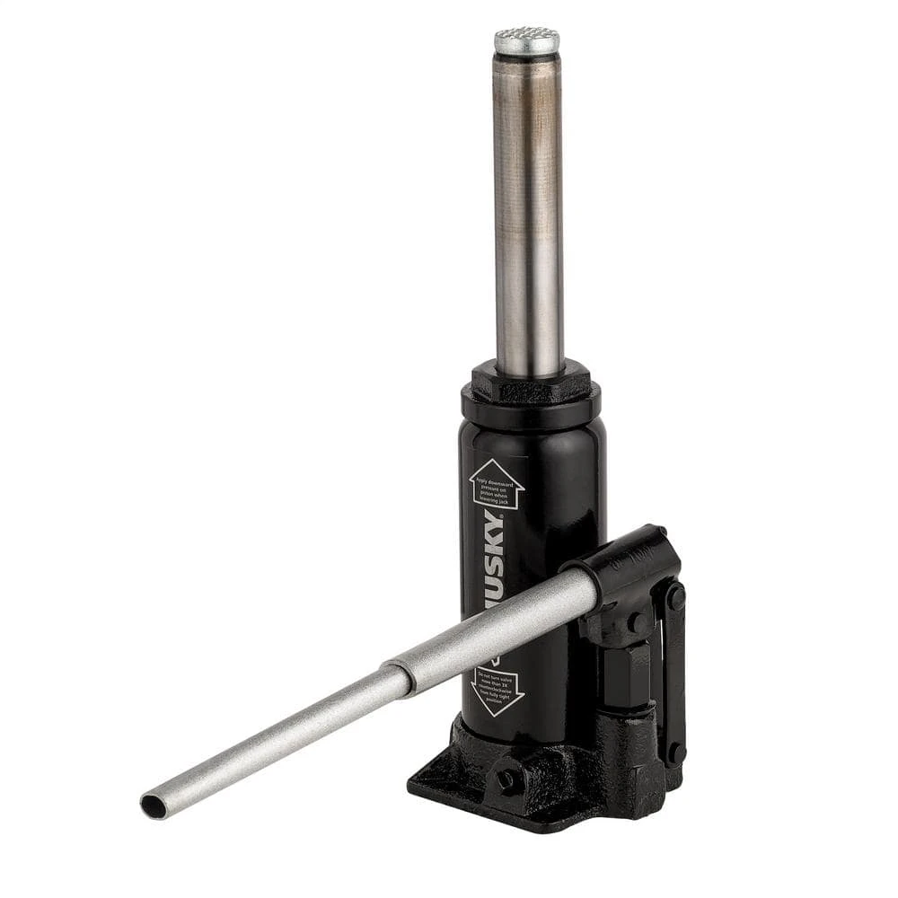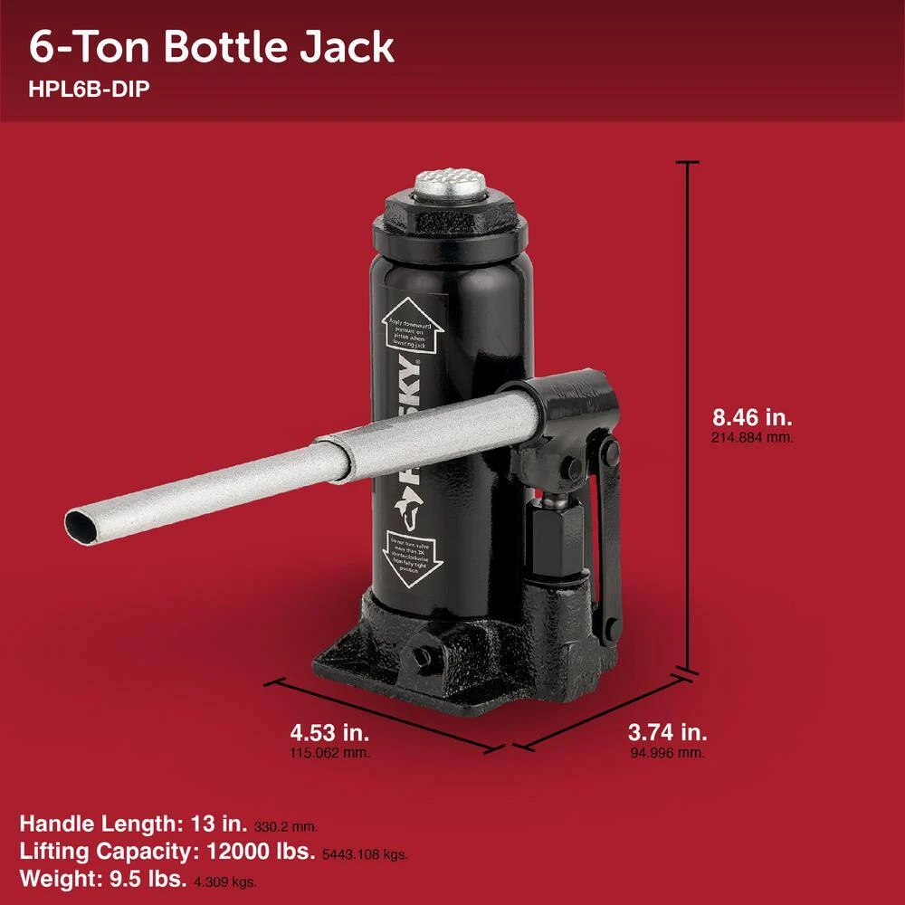 Introducing the versatile Husky 6-ton bottle jack, purpose-built for automotive, industrial, farming, and construction applications. This hydraulic bottle jack boasts a robust 12,000 lbs. lifting capacity and offers a lifting range from 8.5 in. to 16.25 in., providing the flexibility needed for various lifting tasks. Crafted from heavy-duty iron, this bottle jack ensures reliable support and durability in demanding environments. The adjustable load saddle simplifies positioning, allowing for secure and precise lifting of objects. Enhance your Husky collection with the addition of the Husky 6-ton bottle jack, a dependable tool designed to tackle a wide range of lifting challenges with ease.