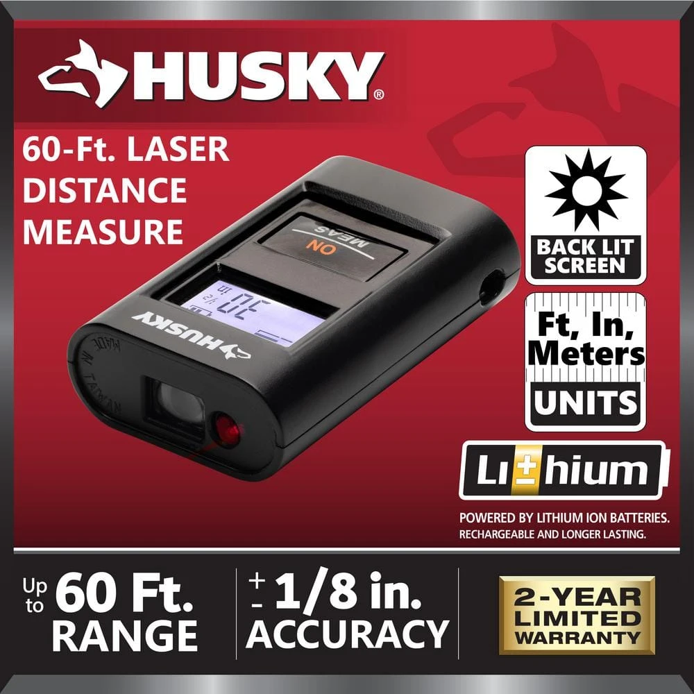 The Husky 60 ft. Laser Distance Measuring Tool is the ideal tool to quickly and accurately measure medium distances. This tool is designed with an easy point-and-shoot, single-summary operation to take measurements in the palm of your hand. The backlit display screen allows for easy measurements for both indoor and outdoor measurements, night or day. The red, class 2 laser allows for measuring in most lighting conditions within 1/8 of an inch. This tool is ideal for quick measurements for real estate, flooring installers, and more.