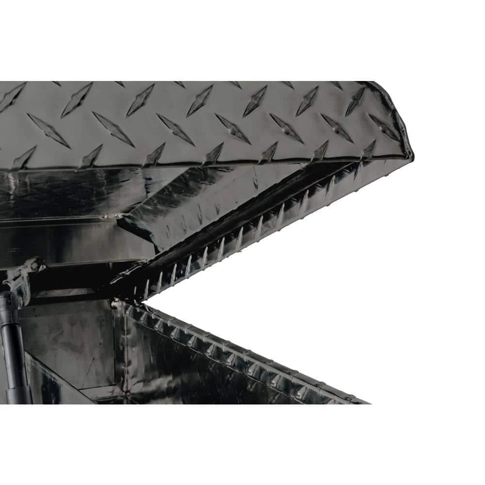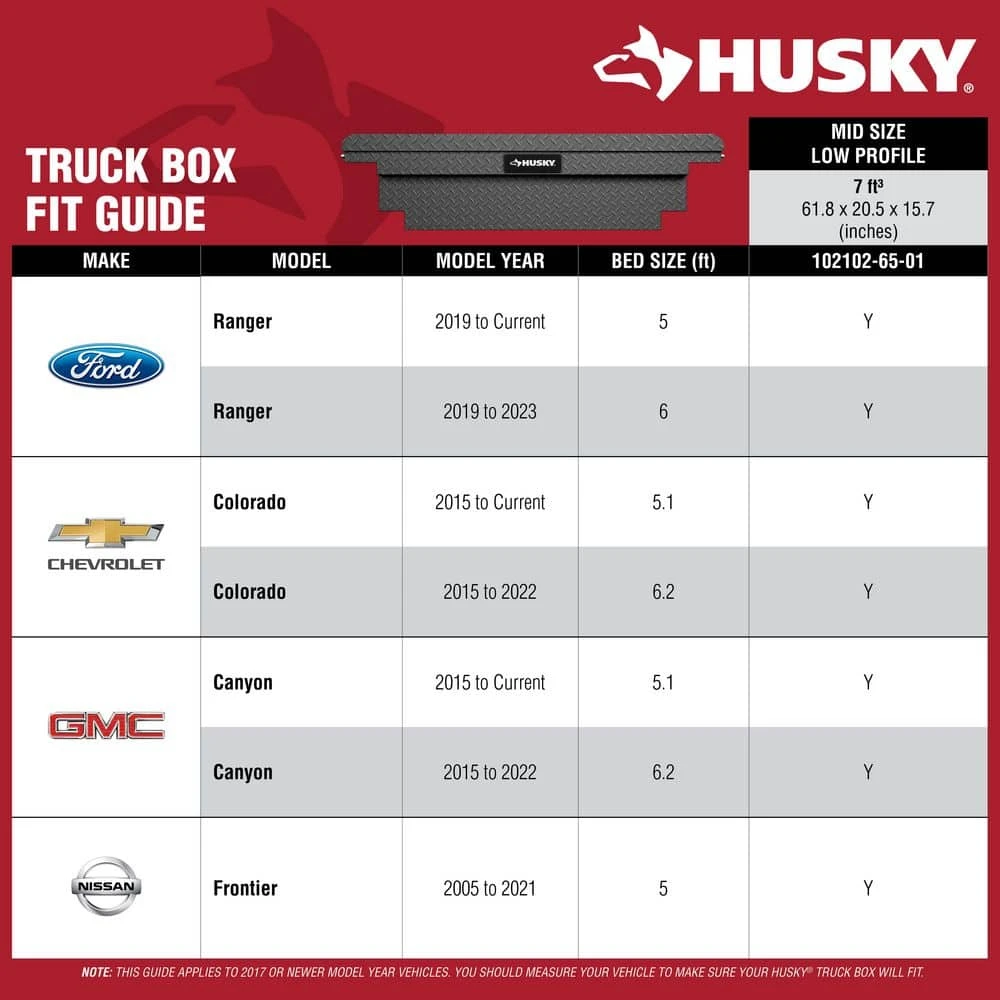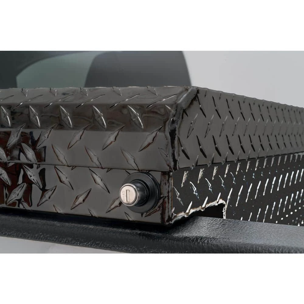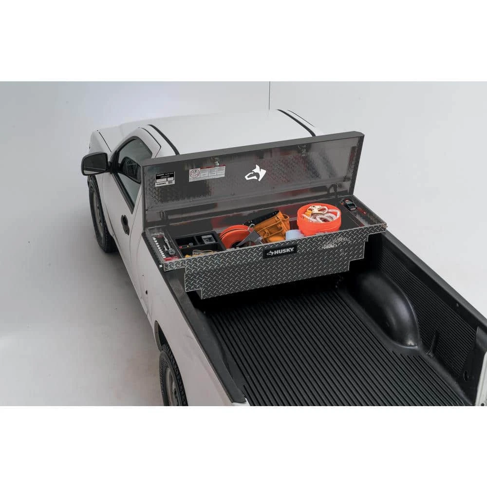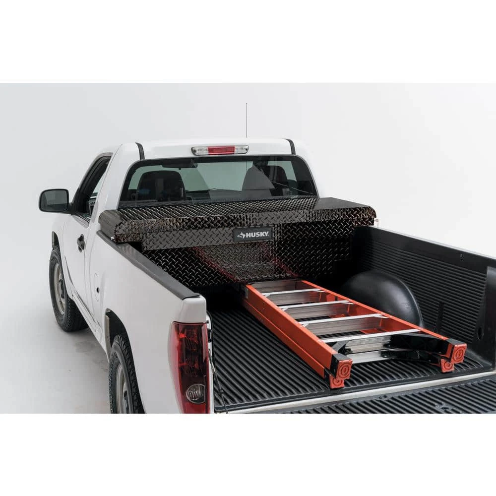 The Husky Graphite Aluminum Low Profile Saddle Box for mid-size trucks provides protection for your tools and equipment from the elements and break-ins. The fully-welded aluminum construction and rubber weather seal protect your items from inclement weather. The easy-to-use, lockable push summarys and fully welded loop strikers help resist break-ins. Included with the box is a sliding plastic tray that allows you to organize and easily access your small tools and hardware. Included as well is the no-drill mounting kit that attaches the truck box to the truck bed easily.