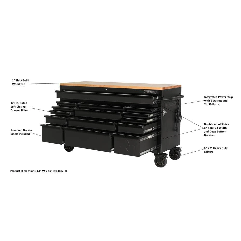 The all new Husky Heavy Duty 61 in. 15-Drawer Mobile Workbench with solid wood top will be a great addition to any garage or workspace. Built to withstand the demands of any workplace setting, this unit is solidly constructed with all-welded 19-Gauge steel. There are also aluminum corner guards fastened in place for further protection against dings and dents. The solid wood top is over 1 in. thick and provides 1,403 sq. in. of workspace. If the need should ever arise, this wood top is sealed on all sides and can also be flipped over. Underneath the work surface are 15-drawers of varying sizes that create 24,187 cu in. of storage space. Each drawer comes equipped with a pre-cut liner, embossed with the Husky logo, to protect and organize all your tools and supplies. All drawers glide effortlessly on 120 lbs. rated ball-bearing slides and feature soft-closing mechanisms to prevent slamming. The full-width drawer and 9 in. D bottom drawers all have a double set of slides to accommodate heavier items. On the right-hand side of the workbench is an integrated power strip with 6 outlets and 2 USB ports that will allow you to charge tools, batteries and other electronic devices. Next to the power strip are cord storage hooks and a bottle opener. Finally, this workbench can be easily moved around the workspace with the large ergonomic handle and heavy-duty 6 in. x 2 in. casters.