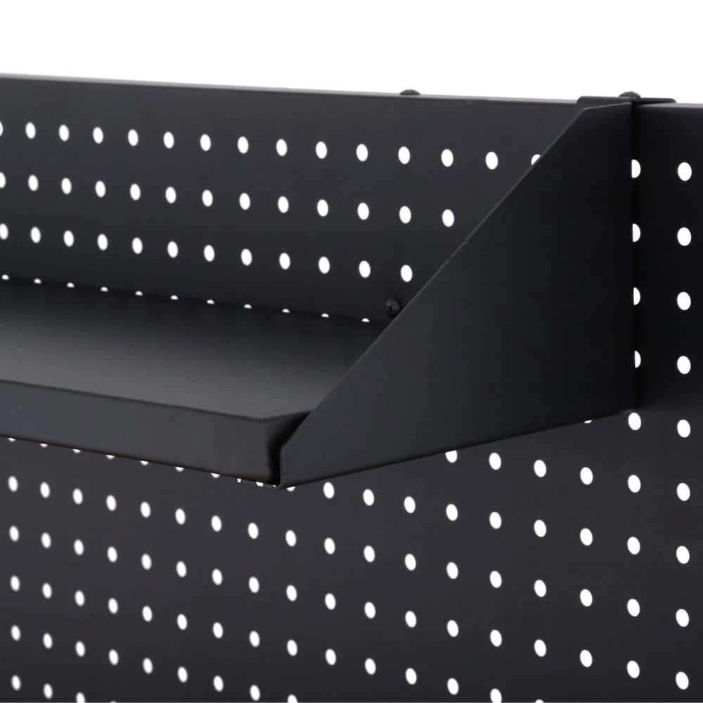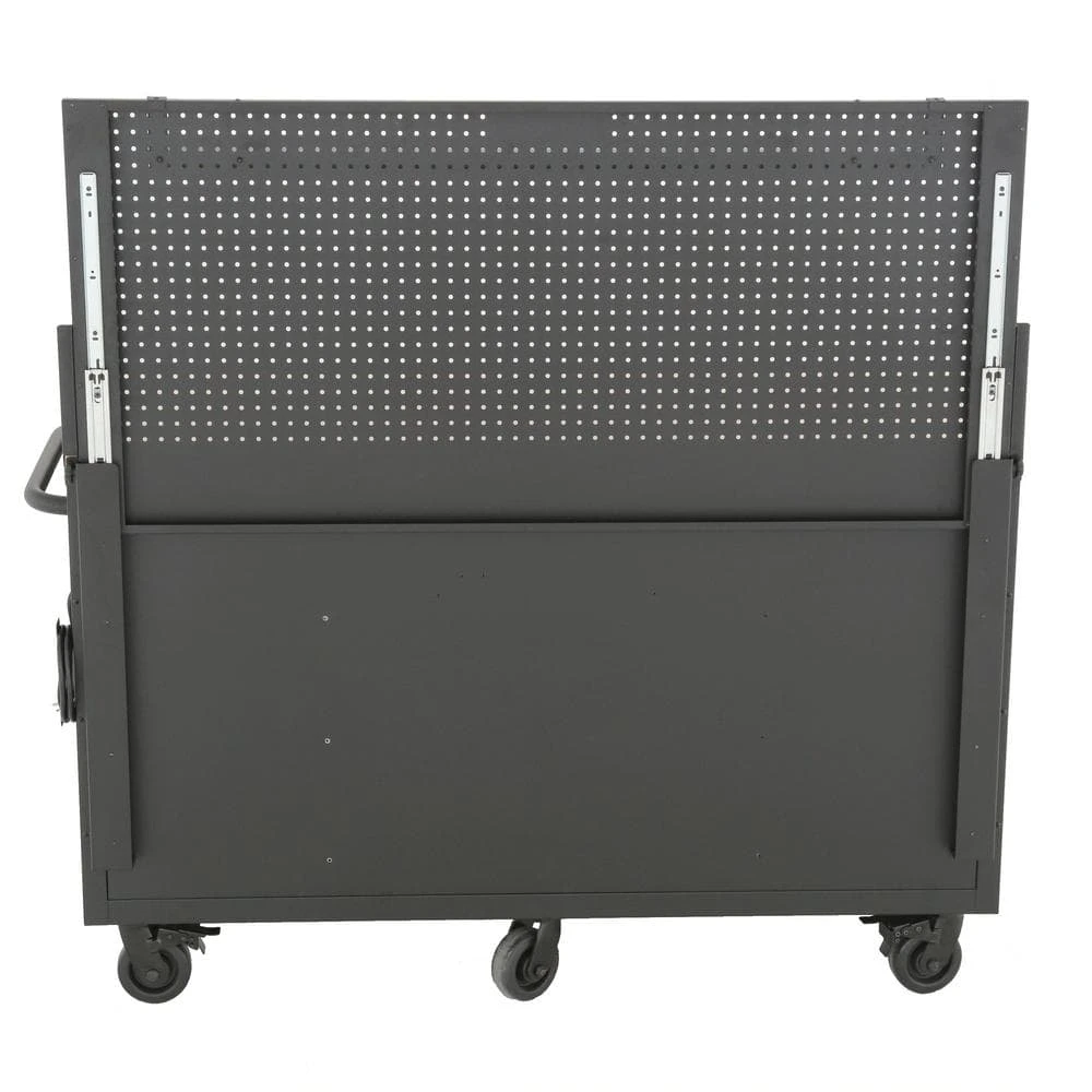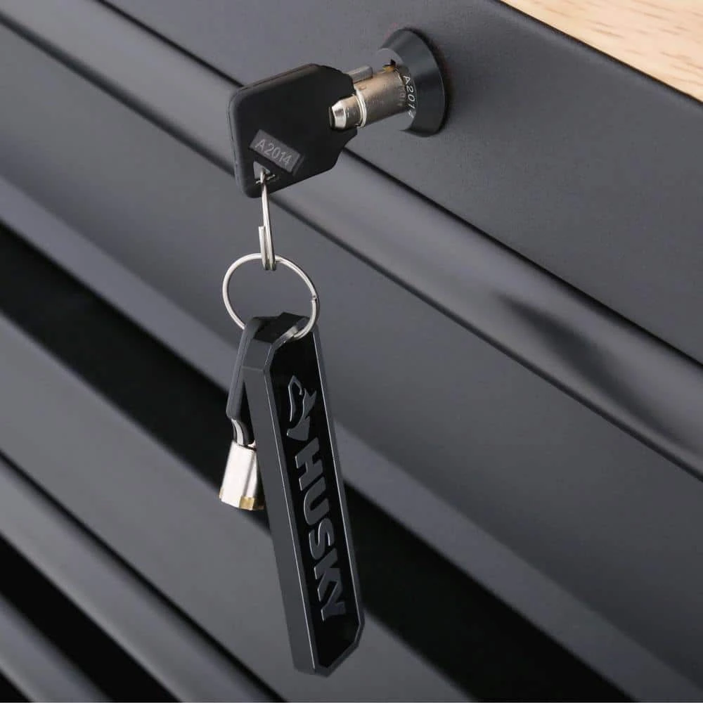 The Husky Heavy Duty Workbench is massive with 26,551 cu. in. of storage space and 2500 lb. load capacity. Built to take on any project, the upgraded features were thoughtfully designed. This rolling tool cabinet has heavier 19-Gauge steel. This workbench is 24 in. deep, which is 6 in. deeper than most standard rolling tool cabinets. The built-in, adjustable-height, 22 in. H steel pegboard back wall can be raised or lowered into (2) different positions and holds up to 200 lbs. It also features a 48 in. shelf that attaches to the pegboard and can hold up to 40 lbs. The 1.2 in. thick, solid wood top is coated with polyurethane for added utility and durability. Charge your power tools with the built-in, 6-outlet, 2 USB power center. The 120 lb. rated, soft-close drawer slides keep the drawers from accidentally opening or from slamming shut. The full-length drawer provides convenient storage for longer items. The 2 deep bottom drawers have double 120 lb. drawer glides. The 1-door storage locker has a storage area that is 13.64 in. W x 20.4 in. H and includes an adjustable-height shelf that can handle a 100 lb. load. There is a side shelf for bottle and can storage inside the door. For added security, both the chest and cabinet are fitted with a key and lock system. The 6 in. x 2 in. industrial grade casters with easy locking pedals help the unit roll smoothly.