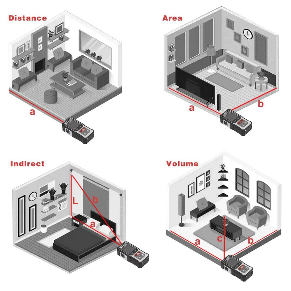 - Multi-function measurement modes: length, area, volume, continuous measurement and addition/subtraction capabilities
