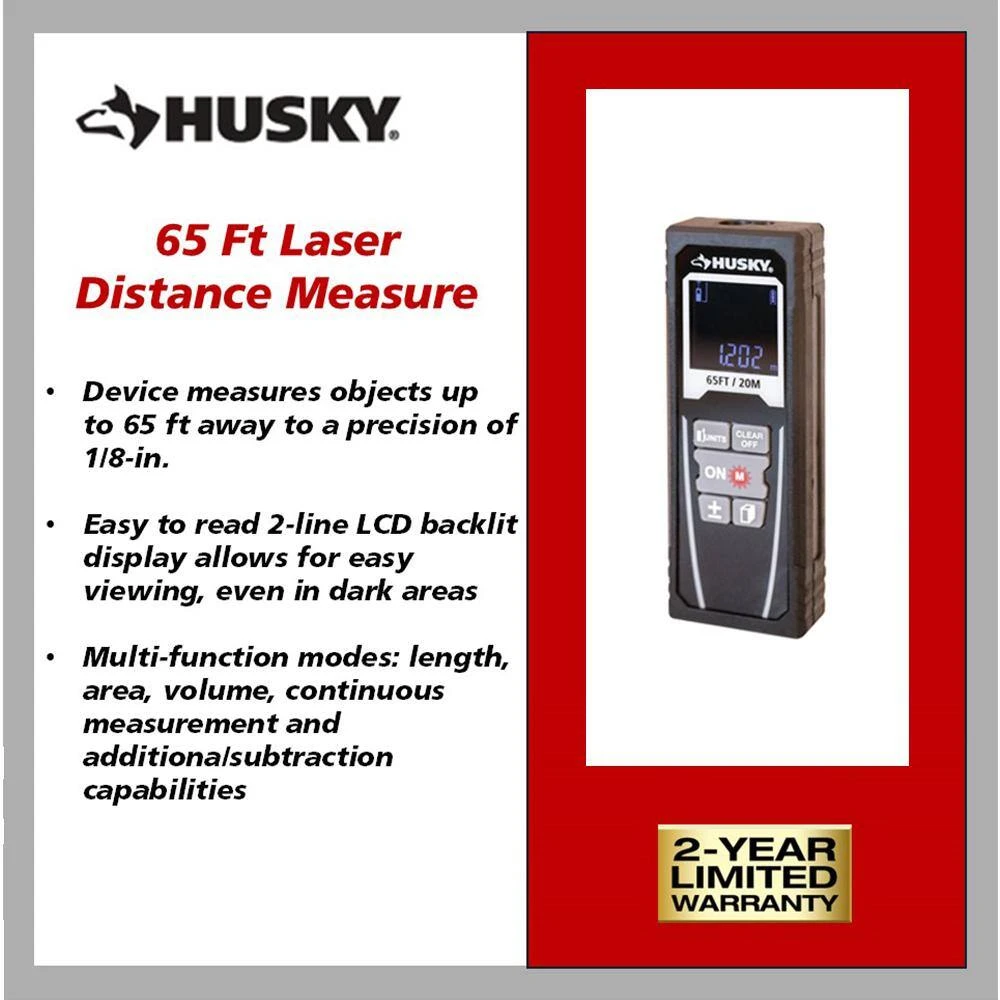 The Husky Compact Laser Measure is the perfect tool for measuring distances indoors. Simply point at an object and the inverted LCD screen will tell you how far away it is, in metric or imperial calculations. The device measures objects up to 65 ft. away, to a precision of 1/8 of an inch. The distance can be measured from the back or the front of the device depending on how you want to use it. You can measure a room’s square (area) or cube (volume) and you can add or subtract distances from a running calculation. This laser measure is even smart enough to indirectly measure distances by employing Pythagorean theorem. The device is protected with an ergonomic soft grip.