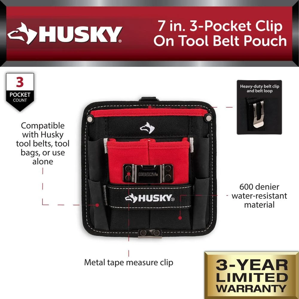 The Husky 7 in. 3 Pocket Tape and Pencil Pouch can be used on its own or can be used in conjunction with your other Husky Tool Bags or Husky Tool Belts for complete tool bag customization. This Tool Pouch is equipped with a Non-Twisting D-Ring for hanging organization and can be worn with either the Heavy-duty Belt Clip or Belt Loop. Features 2 Heavy-duty lined pocket for additional durability. This pouch is the perfect addition to your Husky collection. Constructed of 600 denier water-resistant material. This product carries a 3-year limited warranty.
