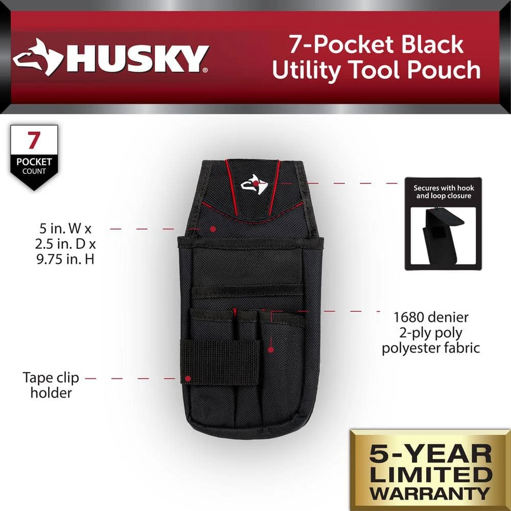The Husky 7-Pocket Utility Tool Pouch is made of a 1680D heavy-duty fabric and features both interior tool storage and exterior pockets for convenient storage. The Husky 7-Pocket Utility Tool Pouch also features back flap, a padded flap that easily attaches over a belt without removing it, or fits in a pants pocket. Rivets are used in key stress points to provide longer durability. This Utility Tool Pouch is great for holding small tools, pens, pencils, utility knives, etc while on the jobsite or at home.