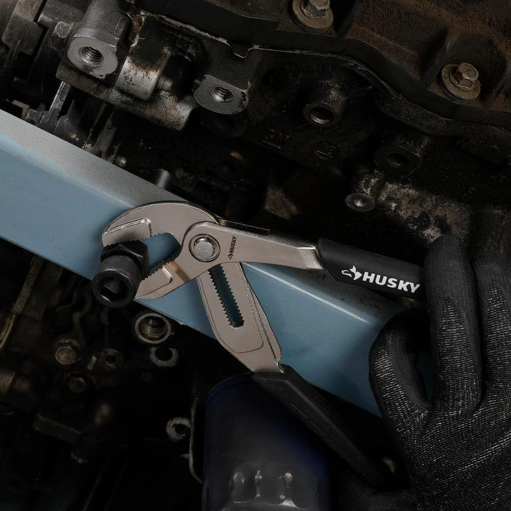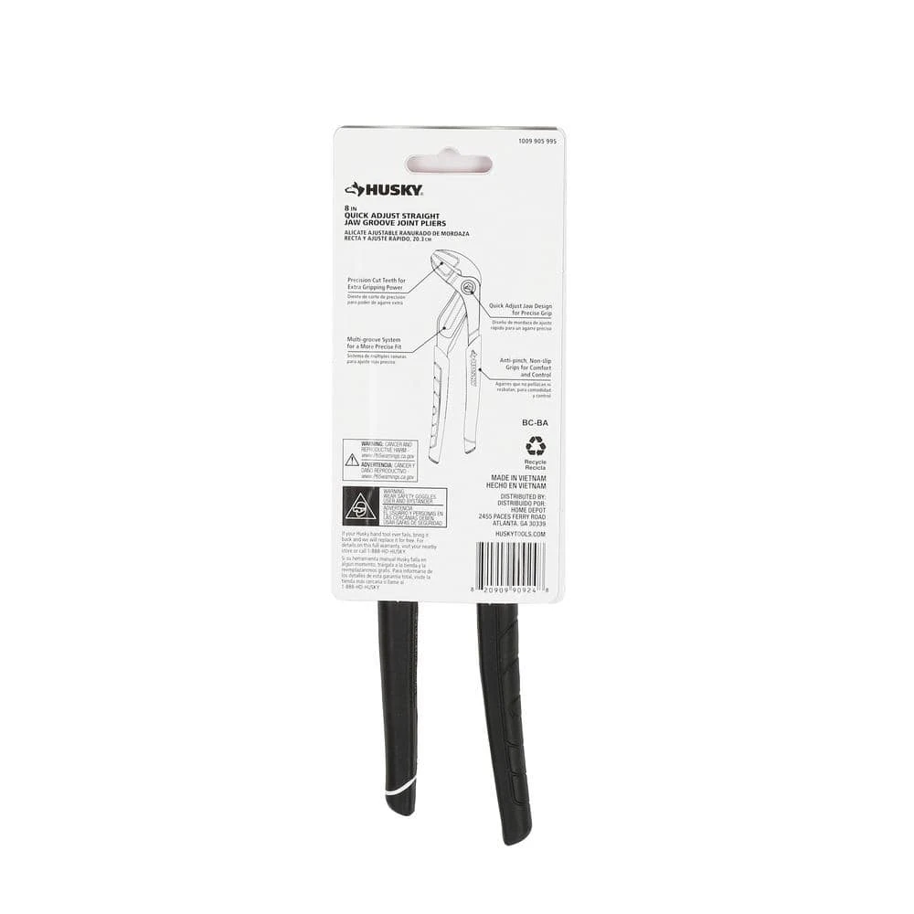 The 8 in. Husky Groove Joint Pliers also known as tongue and groove pliers are often used for gripping irregularly shaped objects. They can also be used for clamping materials. They are also commonly used for turning and holding nuts and bolts. An advantage to this design of pliers is that it can adjust to a number of sizes without the distance in the handle growing wider. These pliers generally have long handles for increased leverage.