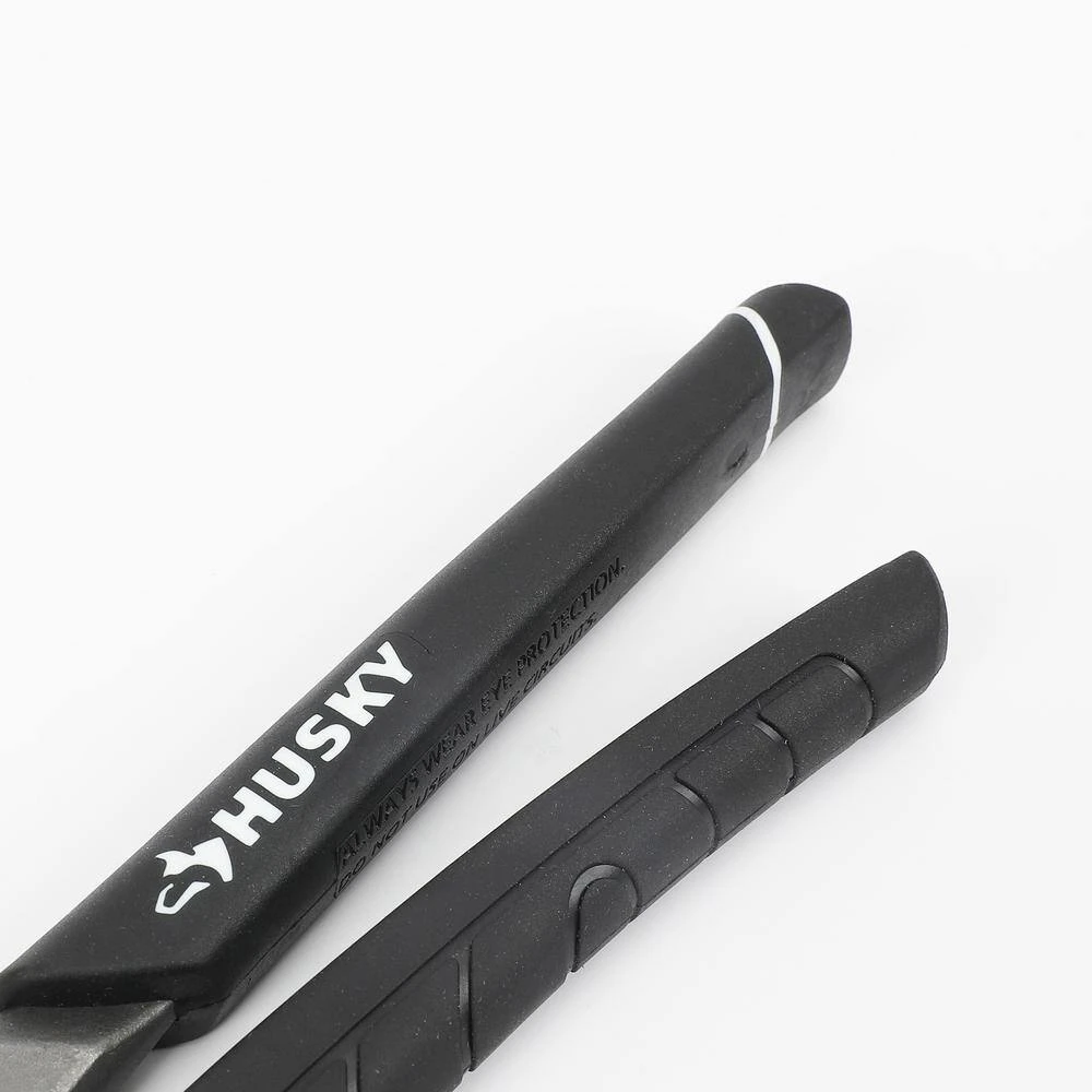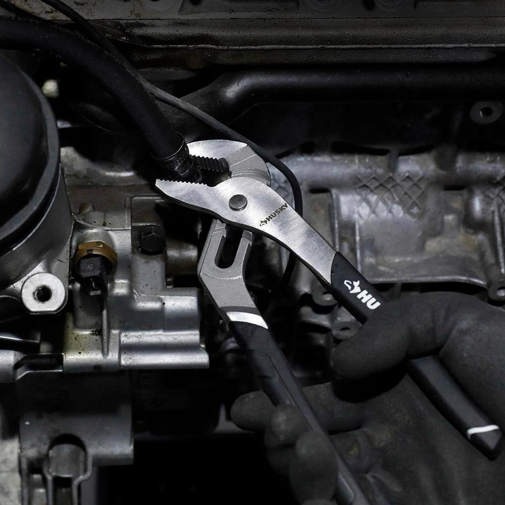The 8 in. Husky Groove Joint Pliers also known as tongue and groove pliers are often used for gripping irregularly shaped objects. They can also be used for clamping materials. They are also commonly used for turning and holding nuts and bolts. An advantage to this design of pliers is that it can adjust to a number of sizes without the distance in the handle growing wider. These pliers generally have long handles for increased leverage.