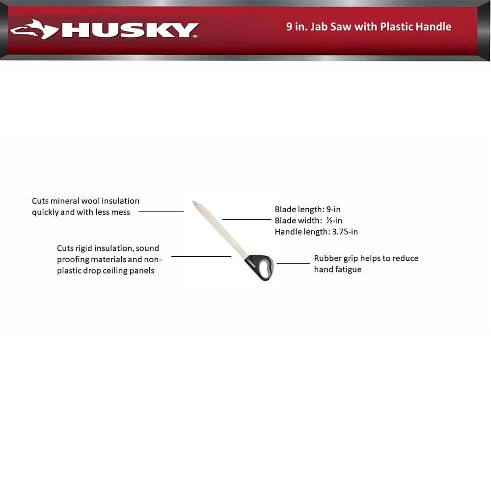 The Husky Insulation Saw cuts mineral wool insulation quickly and with less mess. Due to the unique design of the blade, it acts more like a knife and therefore makes cutting easier. This handy saw can be used to cut rigid insulation, sound proofing materials and non-plastic drop ceiling panels. The rubber grip helps to reduce and minimize fatigue.
