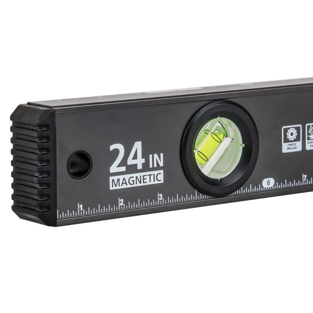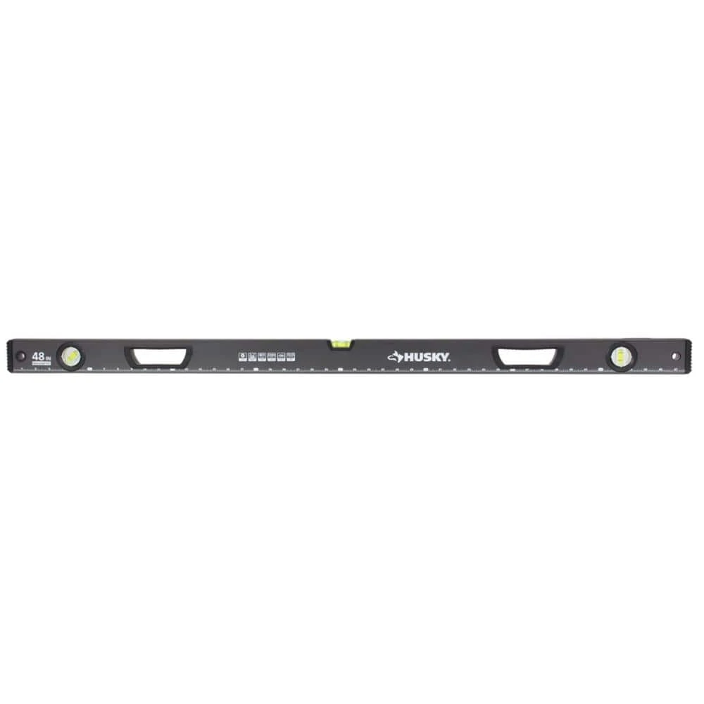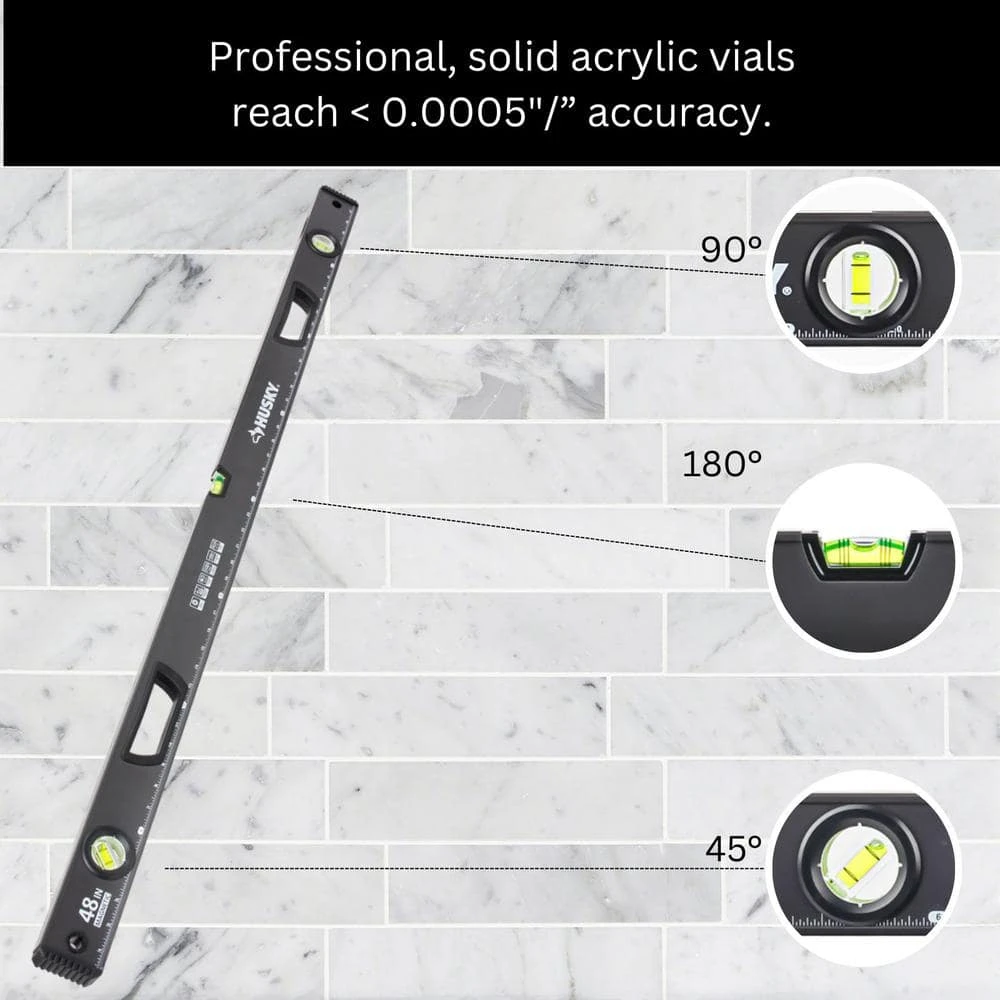 The professional-grade Husky 903 Box Level features VPA certified, hand-calibrated vials to help you level and measure with ease. It features 3 shockproof acrylic vials, and a magnified horizontal vial that is 33% more visible than traditional vials. Our vials have a sensitivity of 0.0005 in./in. (0.5 mm/m) and are machined from an optical-grade acrylic block to provide clear readings and resist breakage. The Husky 903 is fully reversible for quick transitions between floor and ceiling leveling and allows for plumb measuring without parallax errors. These professional levels feature a finely milled surface for precise reads, ergonomic grip handles, and a wall-grip for easy 1-handed use. Housed in a heavy-duty reinforced aluminum profile with 2-handles and shock absorbing rubber end caps, the Husky 903 is built as tough as you are.
