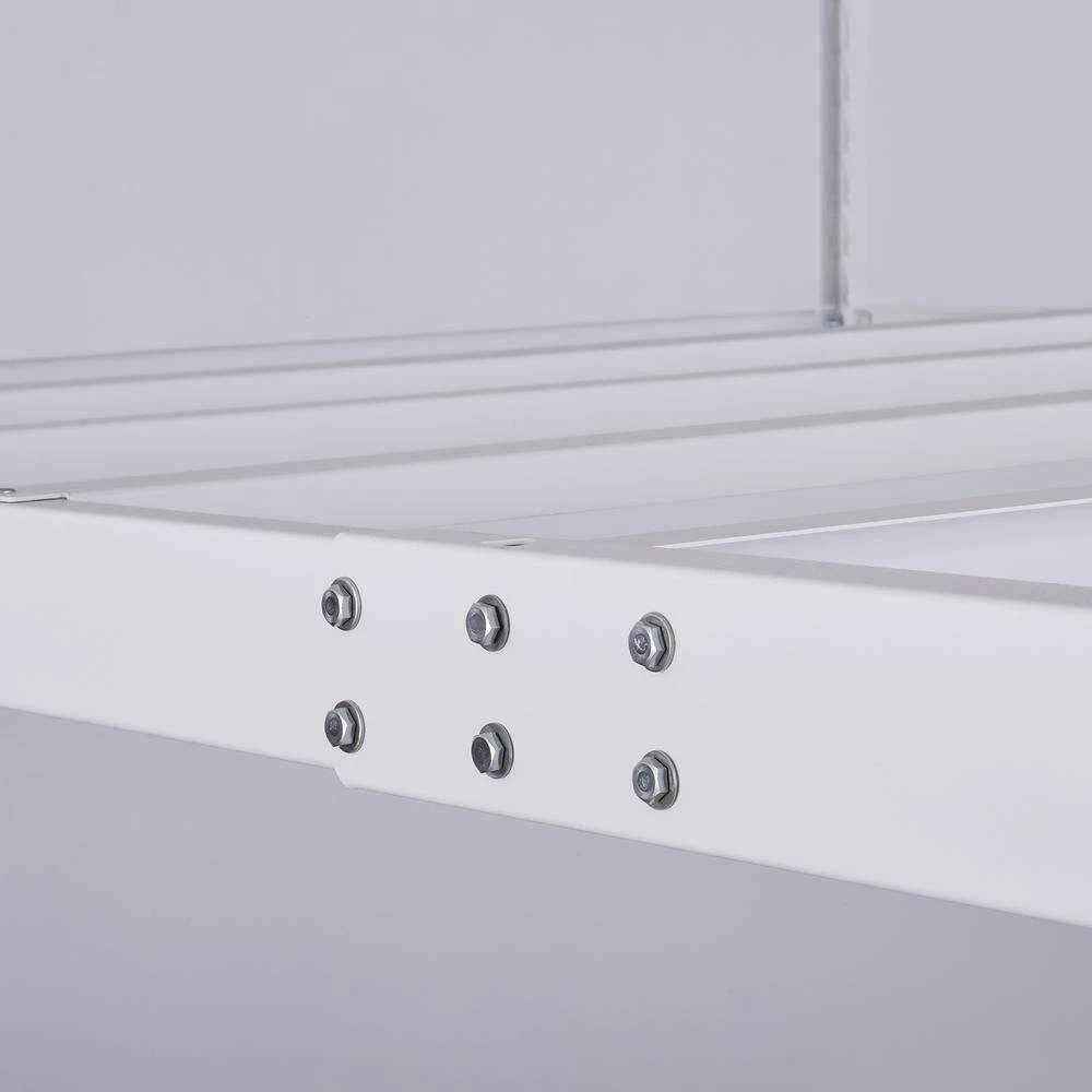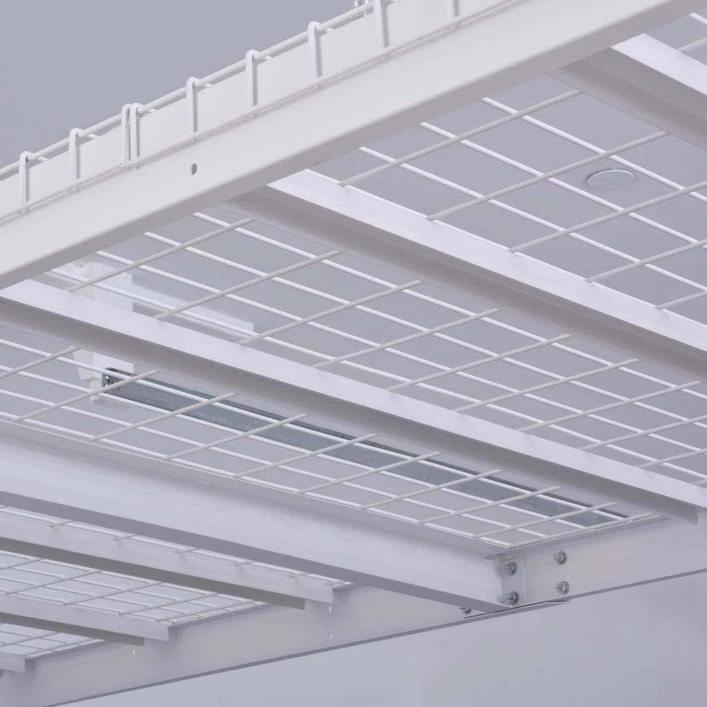 Organize your space with this Adjustable Height Overhead Ceiling Mount Garage Rack in White (97.5 in. W x 43.75 in. H x 32 in. D). It helps keep items from cluttering your garage floor. It features an industrial steel design and can hold up to 600 lbs. Prepare for an easy installation process.