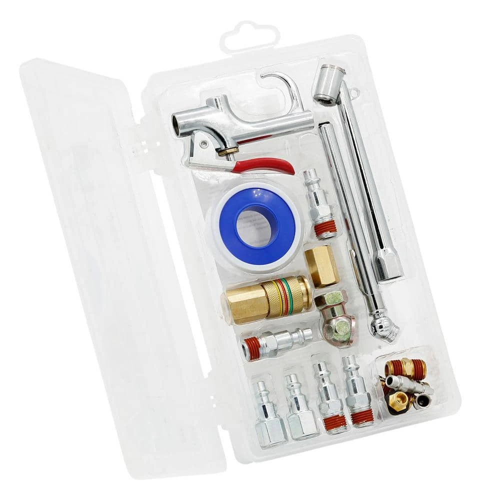 The 20-Piece Air Compressor Accessory Kit comes with various air compressor accessories to help you connect air tools and hoses to compressor, as well as complete many different projects. Its fittings are all 1/4 in. pipe thread and its plugs are 1/4 in. Industrial Milton design, while the coupler is 1/4 in. Universal. The kit has a blow gun that can be used for cleaning surfaces. Includes needles, nozzles and air chuck to help with inflation applications. A reusable case prevents the loss of small parts and makes storage easy.