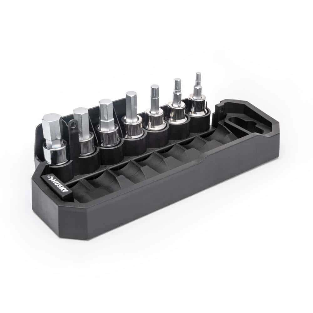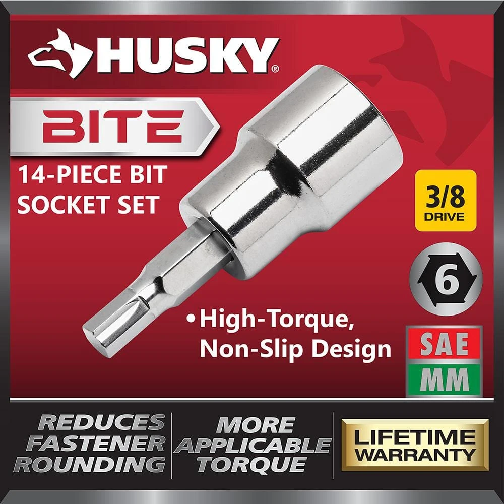The new Husky BITE SAE and Metric Hex Bit Socket Set featuring non-slip bit technology is made from a durable steel alloy for reduced wear. Featuring a unique hex profile on the gripping end, these bit sockets offer the user 10% more applicable torque while reducing the chance of rounding out. BITE bit sockets are designed to remove partially rounded hex cap fasteners and reduce the risk of rounding them in the first place.