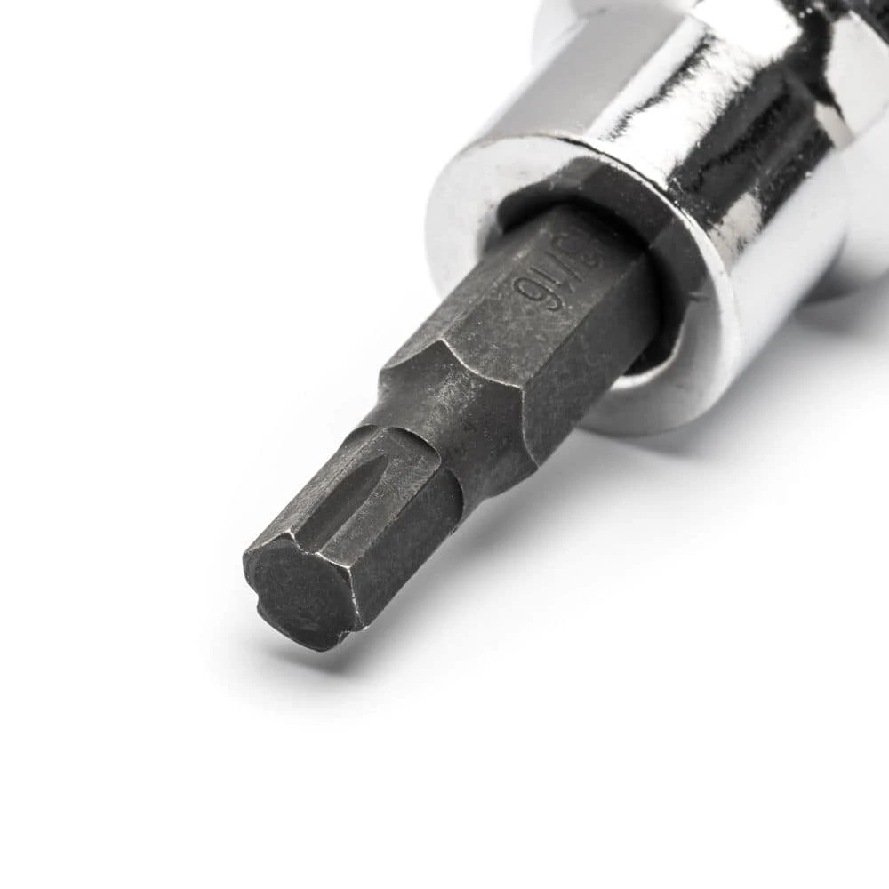 - 14-piece set includes 3/8 in. drive hex bit sockets covering sizes SAE 1/8 in., 5/32 in., 3/16 in, 1/4 in., 5/16 in., 3/8 in., and 7/16 in., and metric 4mm, 5mm, 6mm, 8mm, 9mm, 10mm, and 12mm sizes