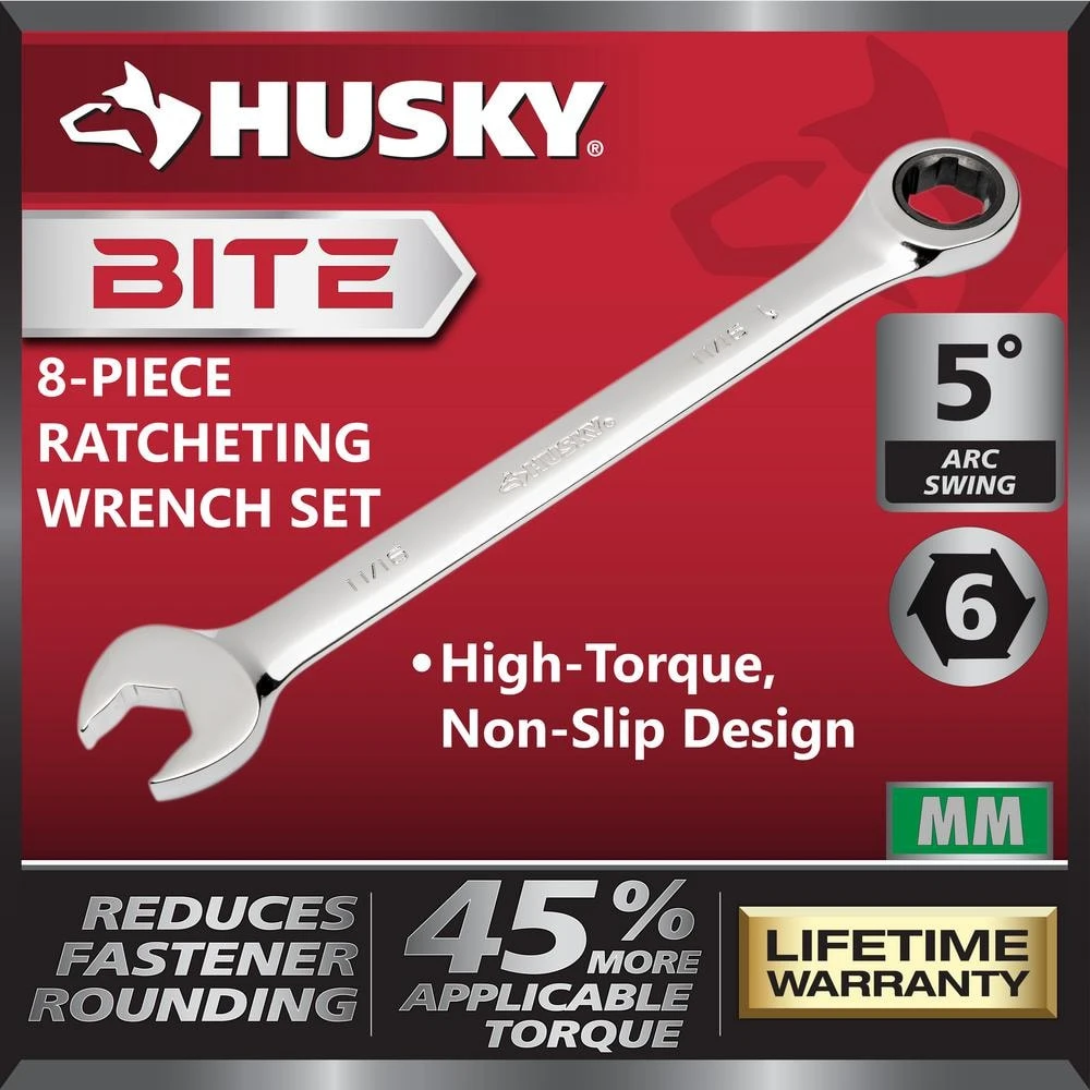 The new Husky BITE Metric Ratcheting Combination Wrenches with BITE technology allow you to get tough jobs done. These wrenches feature an innovative BITE design on both the open and box ends of the wrench. This improved design increases grip strength by focusing rotation force on the flats of the fastener rather than the corners to reduce rounding, allowing the user to apply 45% more torque before a fastener rounds vs. a standard wrench. Each long-pattern wrench is 10% longer than standard Husky wrenches, providing better access to hard-to-reach fasteners. The added length also gives the user greater leverage to remove stubborn nuts and bolts. Husky BITE wrenches offer increased grip on new and rounded fasteners, better access, more torque, and more leverage, making them a great addition to any toolbox.