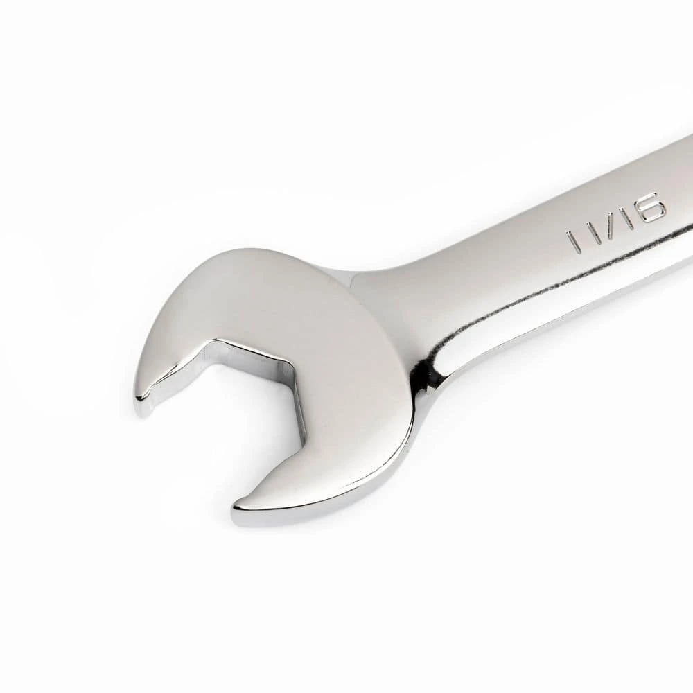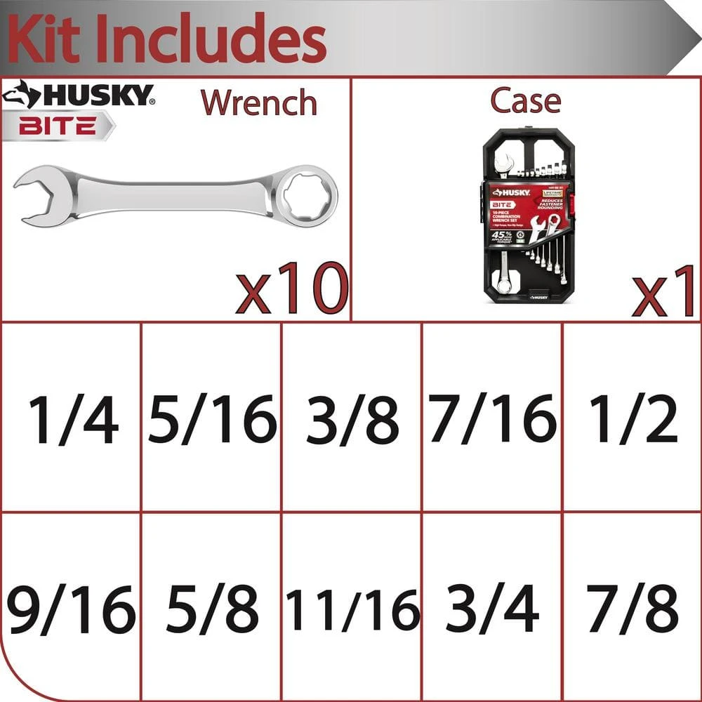 The new Husky BITE SAE Combination Wrenches with BITE technology allow you to get tough jobs done. These wrenches feature an innovative BITE design on both the open and box ends of the wrench. This improved design increases grip strength by focusing rotation force on the flats of the fastener rather than the corners, to reduce rounding, allowing the user to apply 45% more torque before a fastener rounds vs. standard wrenches. Each long-pattern wrench is 10% longer than standard Husky wrenches, providing better access to hard-to-reach fasteners. The added length also gives the user greater leverage to remove stubborn nuts and bolts. Husky BITE wrenches offer increased grip on new and rounded fasteners, better access, more torque, and more leverage, making them a great addition to any toolbox.