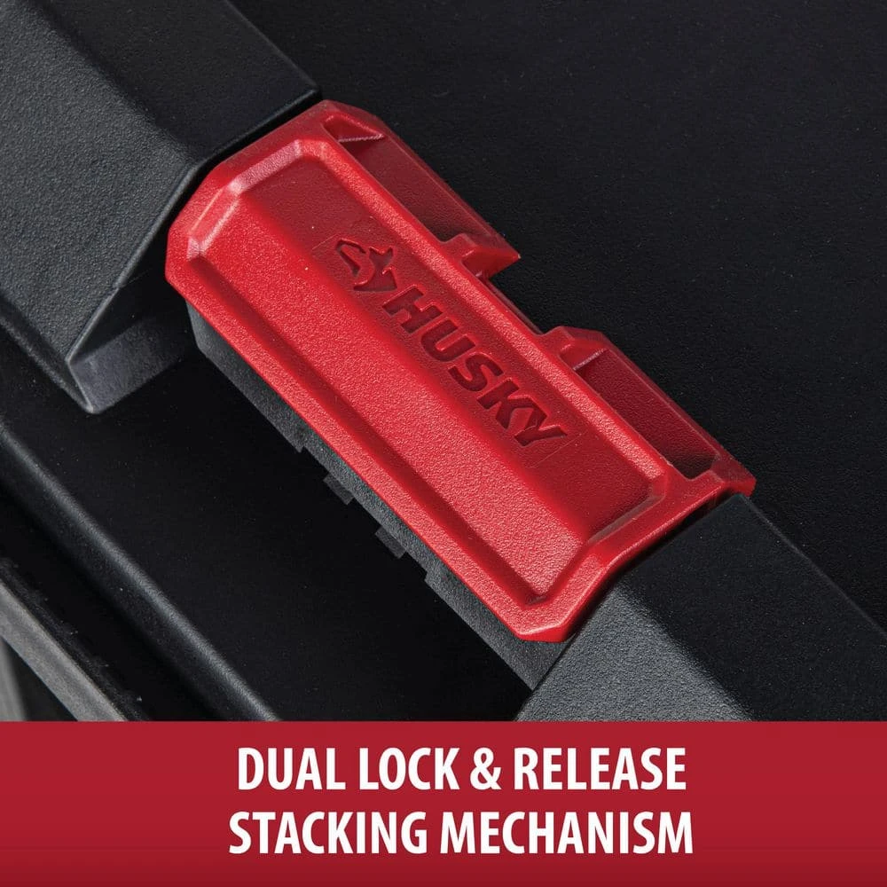 The Husky Build-Out Multipurpose Dolly is perfect for moving the Build-Out system around the shop, warehouse, office or garage. The dual lock and release stacking mechanism makes it simple to securely stack and quickly reconfigure your Build-Out system. The Multipurpose Dolly has a 300 lbs. total loading capacity with impact-resistant material and heavy-duty swivel casters. The non-marking casters are equipped with independent brakes to ensure stable positioning and smooth movement. The dolly comes with integrated carrying handles and 4 pass-through connection points. Stack any configuration of Build-Out components to create your ideal storage solution.