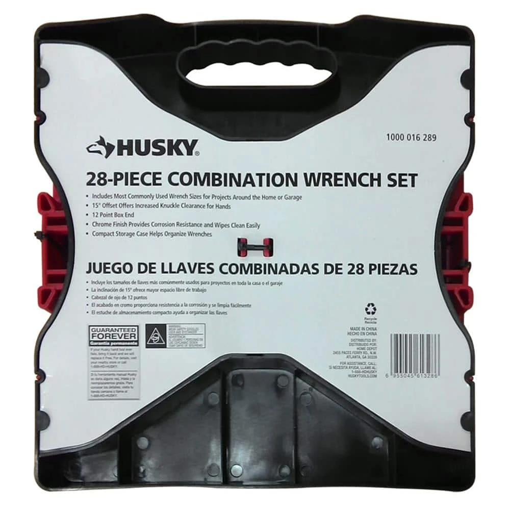 This 28-Piece Wrench set includes most commonly used Wrench Sizes for Projects Around the Home or Garage. All the 28-Piece wrenches are 15ยฐ Offset Offers increased Knuckle Clearance for Hands. All the 28-Piece wrenches provide corrosion resistance.