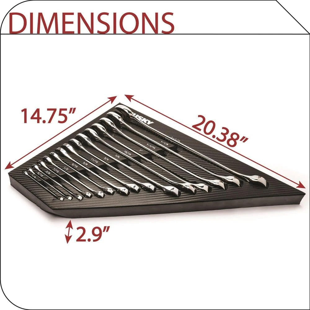 This Husky EVA foam storage tray holds 15 combination wrenches and is a great solution for garage organization needs. Sizes are clearly marked for quick identification so nothing will slow you down. Fit this tray inside your toolbox drawer or anywhere in your shop for structured storage wherever you need it.
