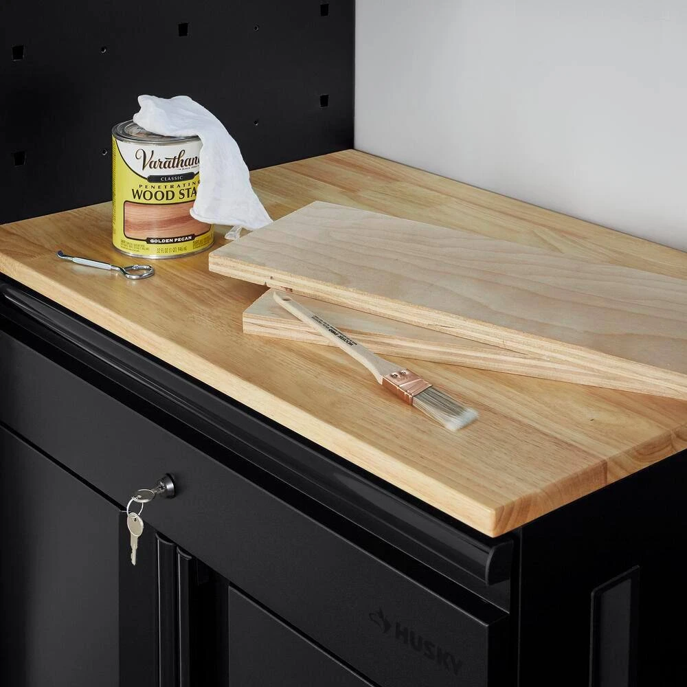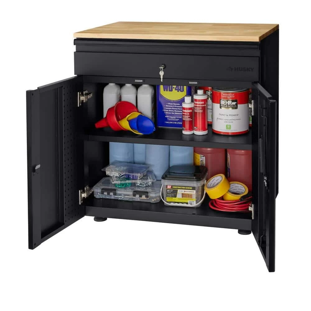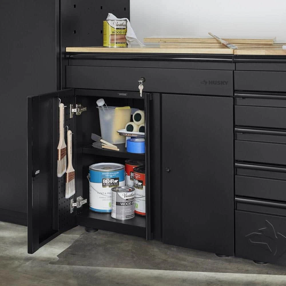 Organize your garage with this Husky two-door base cabinet. With one adjustable height shelf and a drawer, you can store your tools and equipment how you want. Soft-close drawers ensure smooth operation. A three-point mechanical locking system helps keep your items secure. For lasting use, this pre-assembled cabinet comes with tough 20-gauge steel construction and a scratch-resistant powder-coated finish.