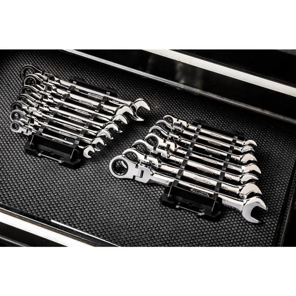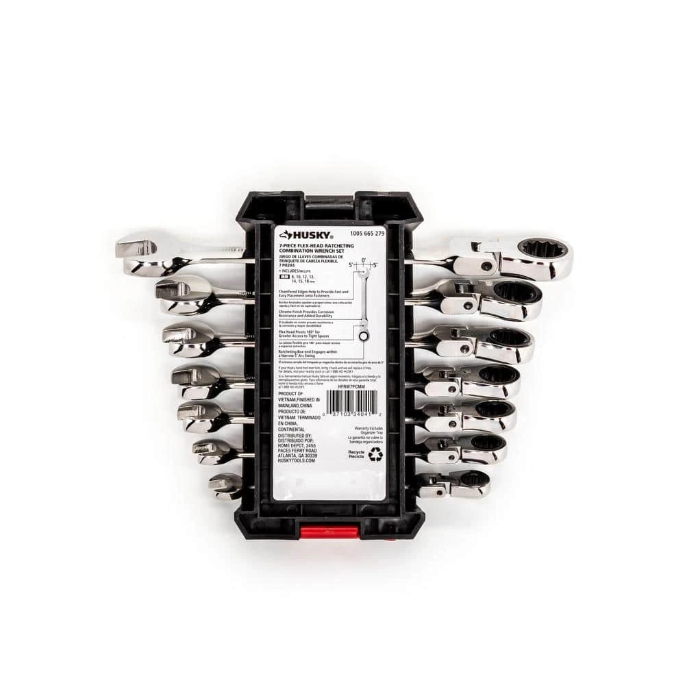 The versatile design of the 180ยฐ flexible head on these Husky ratcheting wrenches allows you to reach even the most troublesome fasteners. Their ratcheting box end design needs only 5ยฐ of rotation to engage fasteners and apply torque. Each wrench has a knurled side to its beam for easy identification of the ratcheting direction so you will know exactly if you are tightening or loosening the fastener.