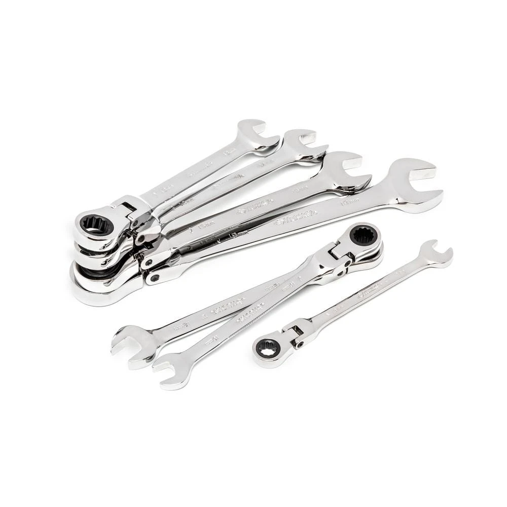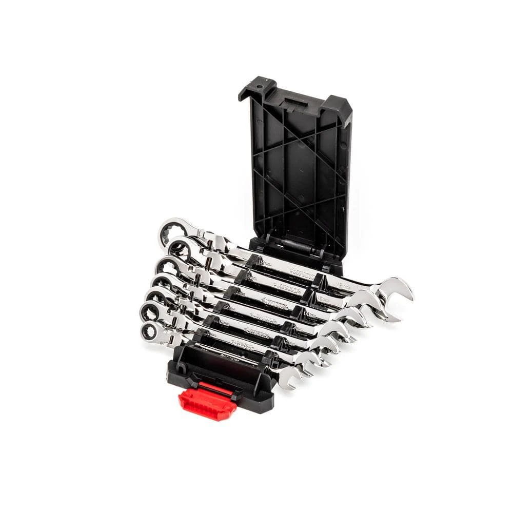 - 7-piece set includes flex-head ratcheting wrenches covering sizes 8mm, 10mm, 12mm, 13mm, 14mm, 15mm, and 18 mm