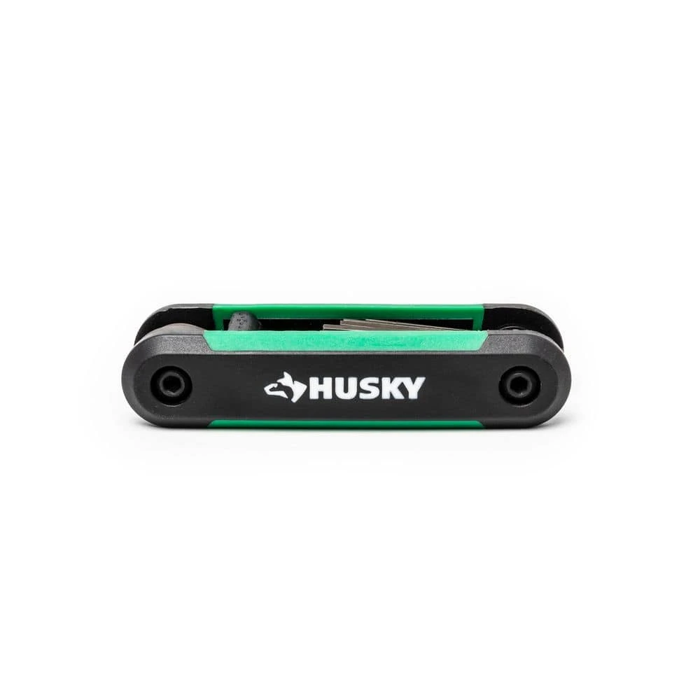 The Husky 8-Piece Metric Folding Hex Key Set is made of alloy steel for strength. It includes a range of metric hex keys that resist rotational distortion and fold up into the handle for efficient organization. The finish provides resistance to corrosion.